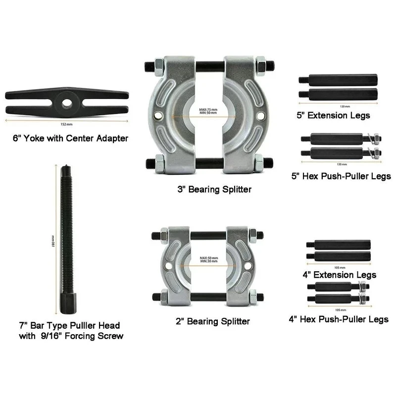 Благодаря кованой конструкции, разделитель подшипника и Набор съемников поставляются с двумя наиболее широко используемыми разветвителями подшипников 30-50 мм и 50-75 мм, вместе с тянущими компонентами для безопасного удаления подшипников. В комплект также входит пулер типа бар с винтом 9/16 ".Прочная кованая конструкцияИмеет четыре набора шестигранных выдвижных ножек4 "и 5" выдвижные ножки6 "хомут с центральным адаптеромБар-тип пулер головка с 9/16 "форсирующий винт