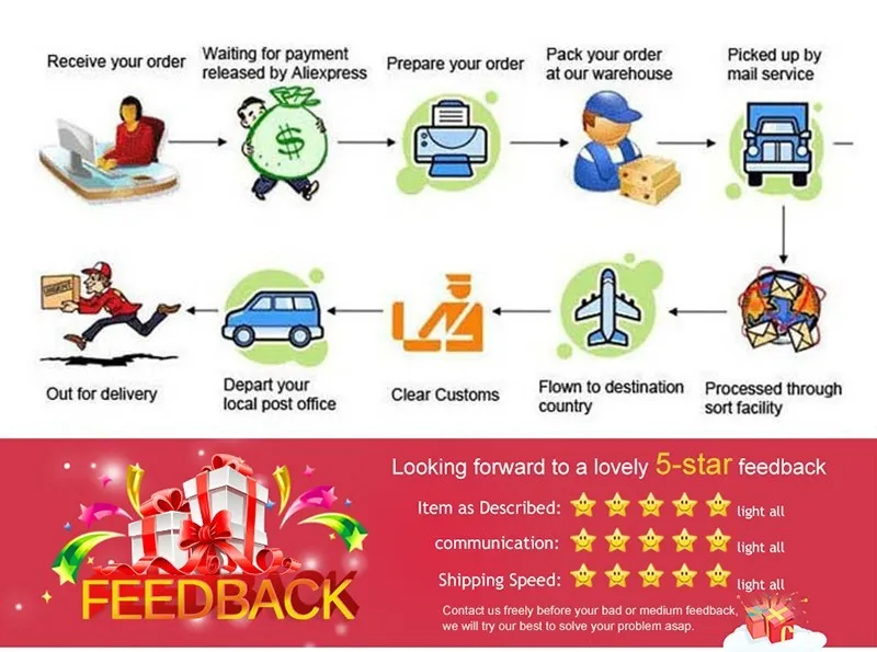 6.Ожидаемая дата доставки будет зависеть от таможни, погоды и т. д., иногда это может занять немного больше времени, чтобы получить,Пожалуйста, свяжитесь с нами, когда вы не получили посылка, чтобы продлить срок защиты вашего заказа.
