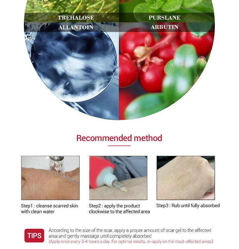 Советы:В соответствии с размером шрамов нанесите правильное количество шрамового геля на пораженный участок и аккуратно массируйте до полного впитывания