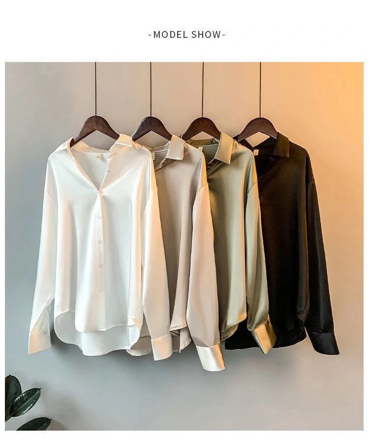 Женская атласная блузка на пуговицах, белая блузка с длинным рукавом