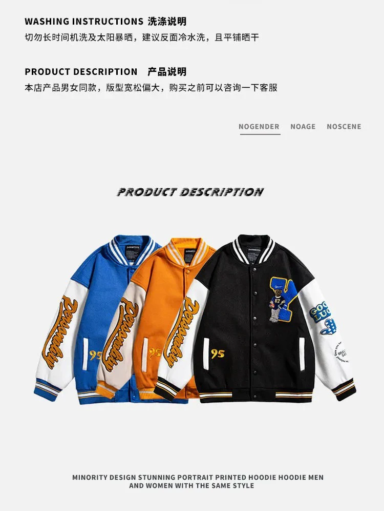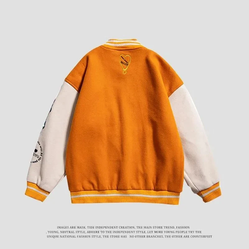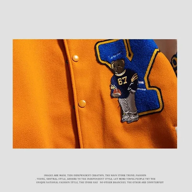 Мужская университетская куртка-бомбер оранжевого и синего цвета с вышитым плюшевым медведем, женские пальто большого размера, бейсбольная куртка Letterman, Университетская одежда для улицы