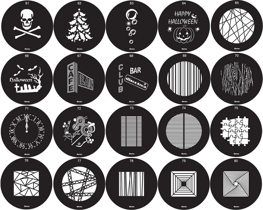 Gobos, широко используются дизайнерами в театре, кино, фотографии и телевидения для создания атмосферы, пейзажа проекта и, как правило, усиливают визуальное воздействие их освещения. Для обеспечения целостности дизайна узоры выгравированы с помощью точного двухстороннего процесса на нержавеющей стали. Результат прочный, высокое качество узоров, которые будут выдерживать экстремальное тепло у ворот эллипсоидальных прожекторов.