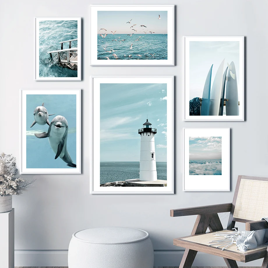 Скандинавский пляж, дельфин, доска для серфинга, пальма, море, скан...