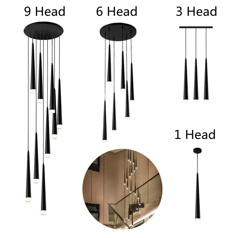 Черная коническая трубка Светодиодная Люстра Столовая лестница Регу...