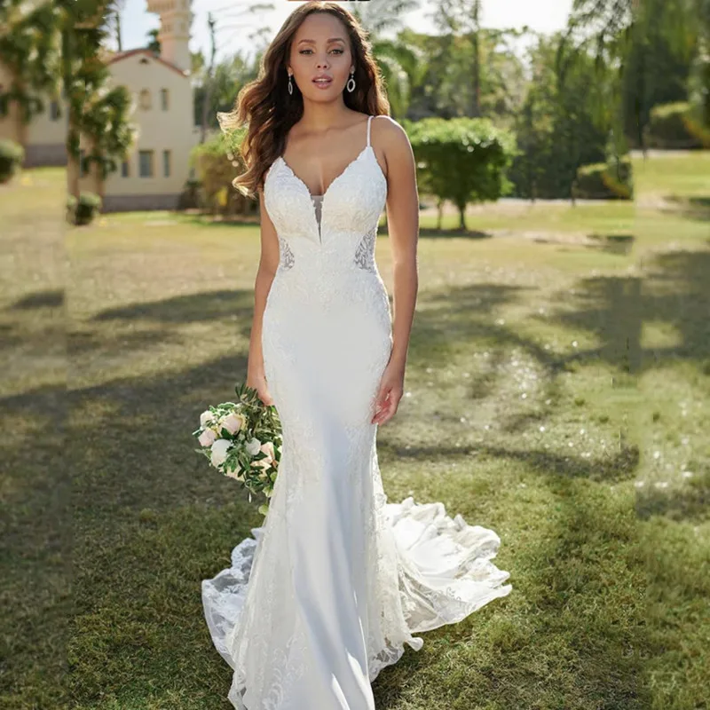 Кружевное свадебное платье-Русалка на бретельках, с V-образным вырезом, открытой спиной и аппликацией, без рукавов, с длинным шлейфом, платье невесты на пуговицах, 2021