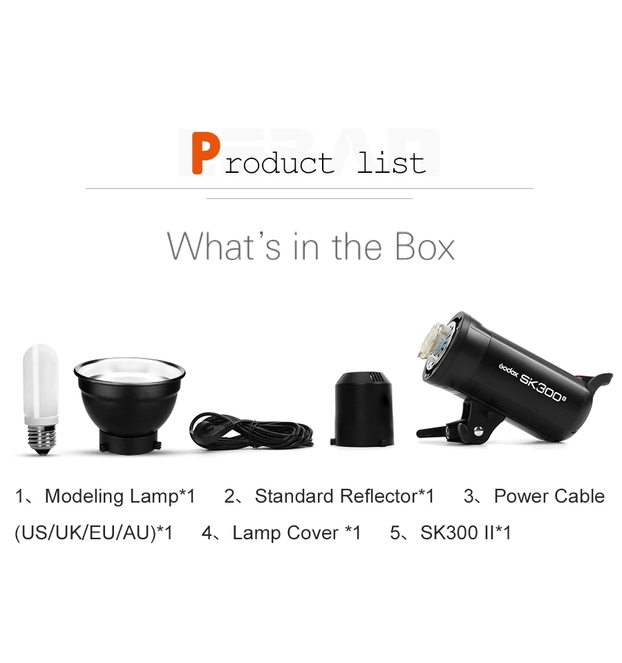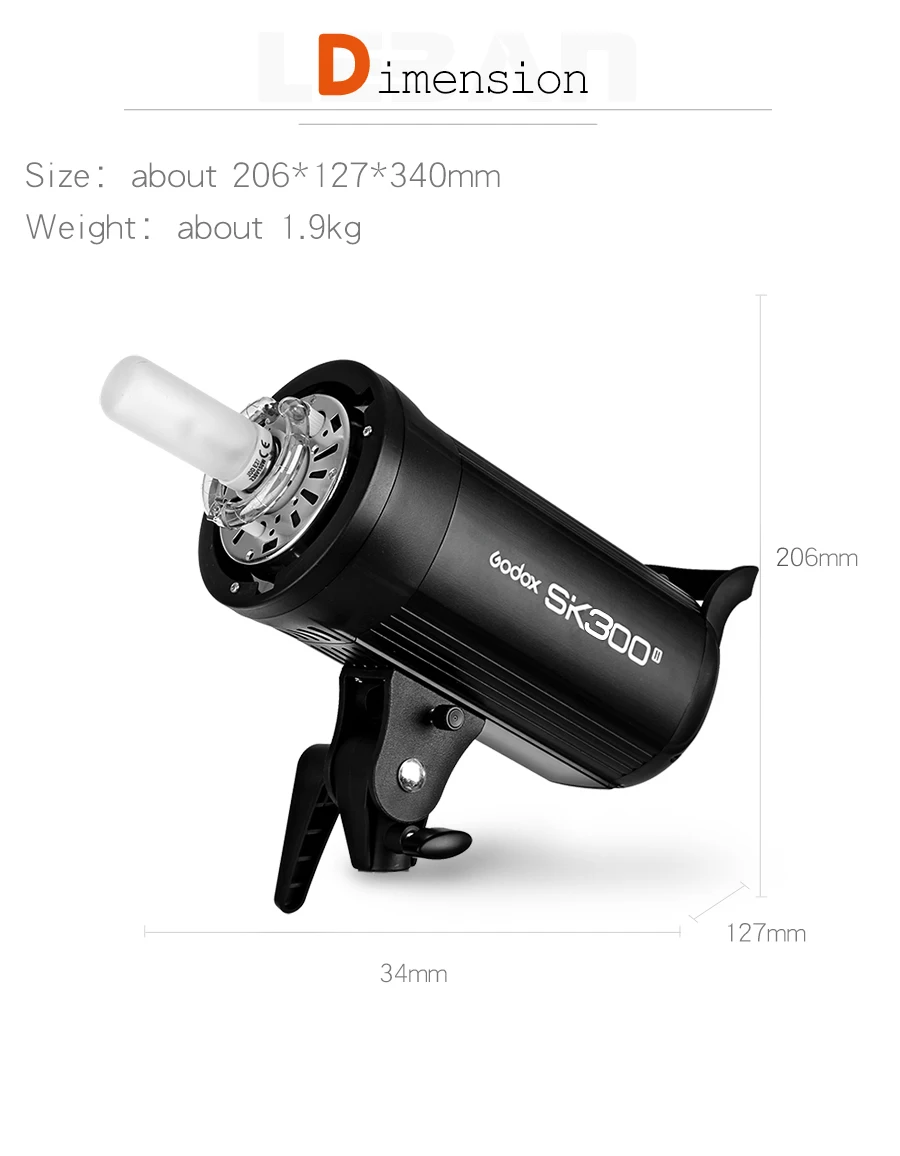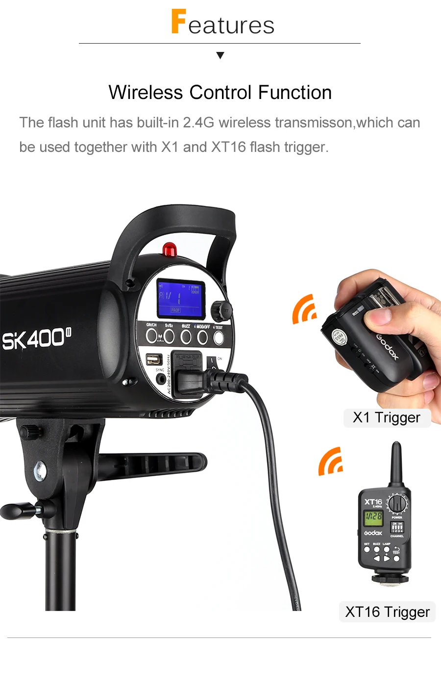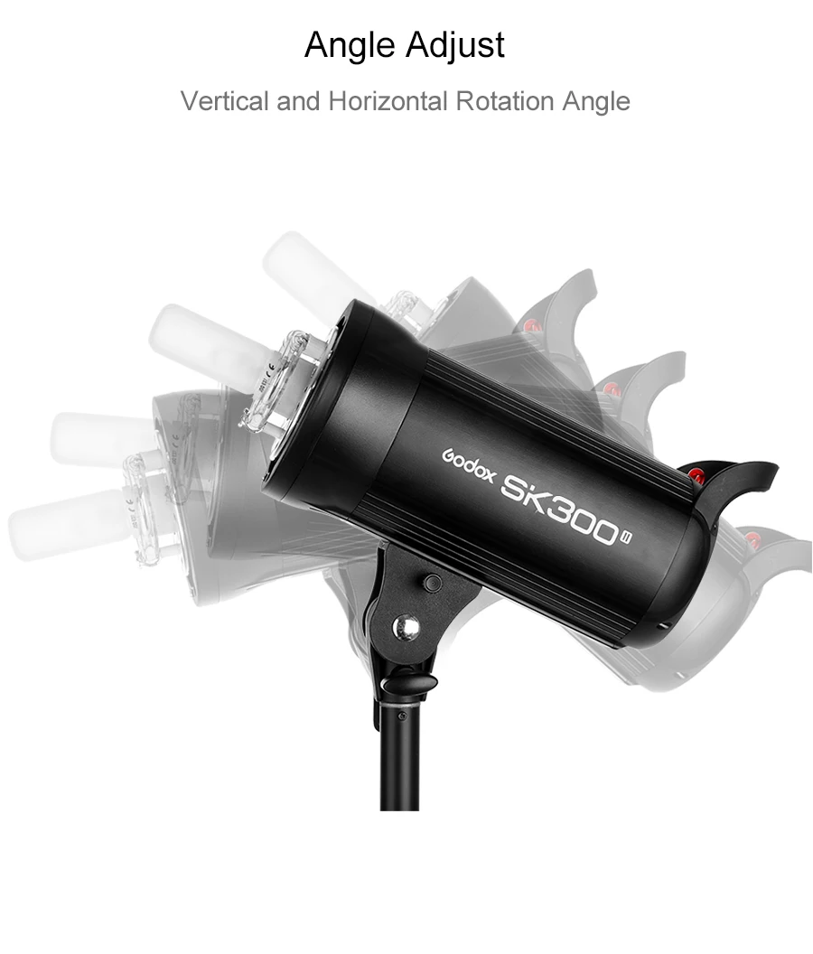 Благодаря встроенной беспроводной системе Godox 2,4G, серия SKII является экономически эффективным компактным стробоскопическим устройством для съёмки, портретной и образа жизни в электронной коммерции. В студийной съемке smalland medium он может работать как высокий светильник, фоновый светильник или светильник для волос.