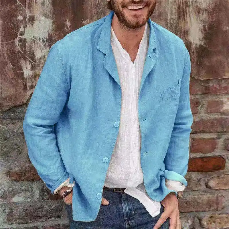 Куртка мужская с отложным воротником на пуговицах, модная уличная одежда, повседневный однотонный пиджак, жакет из хлопка и льна, весна