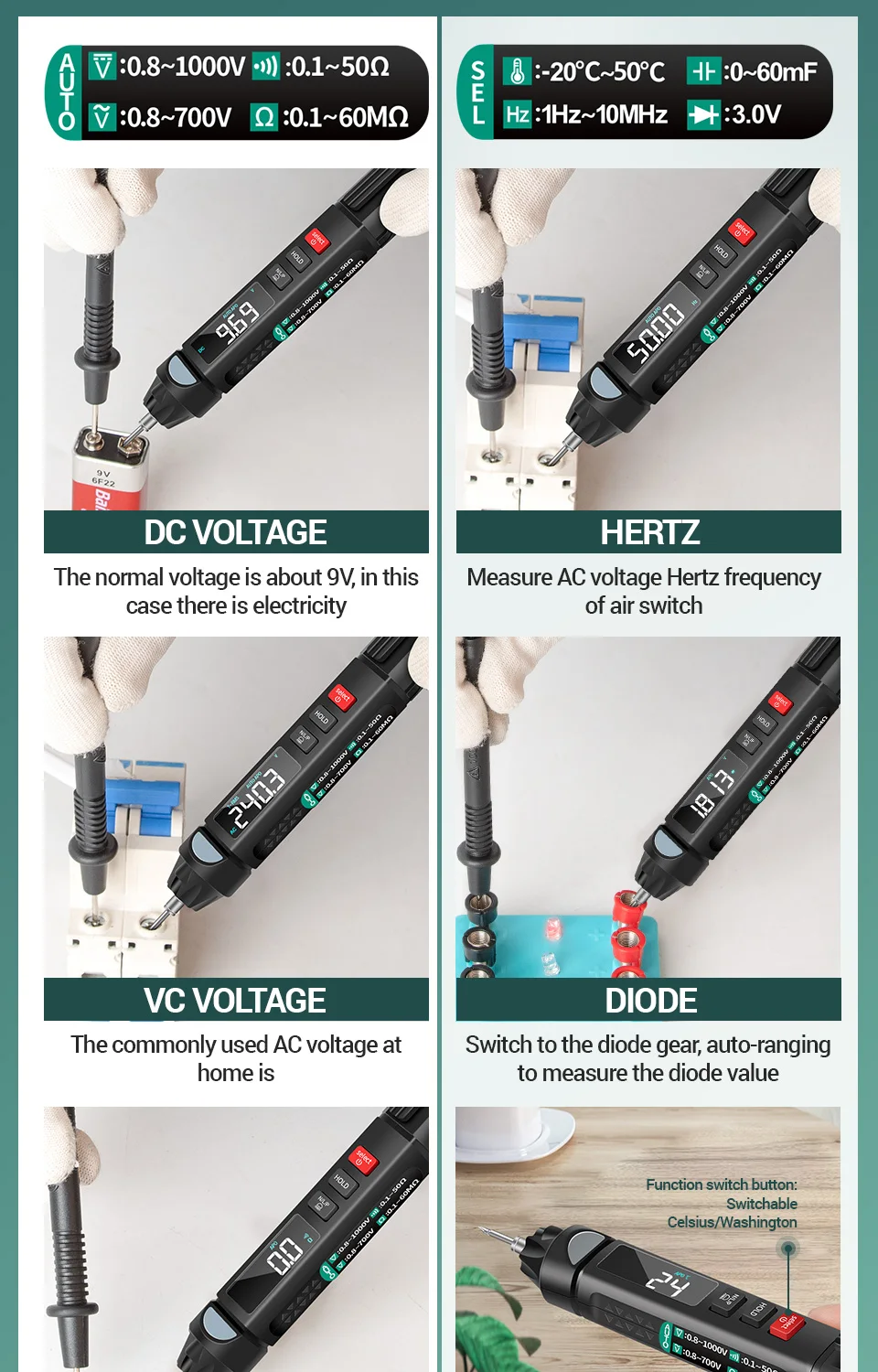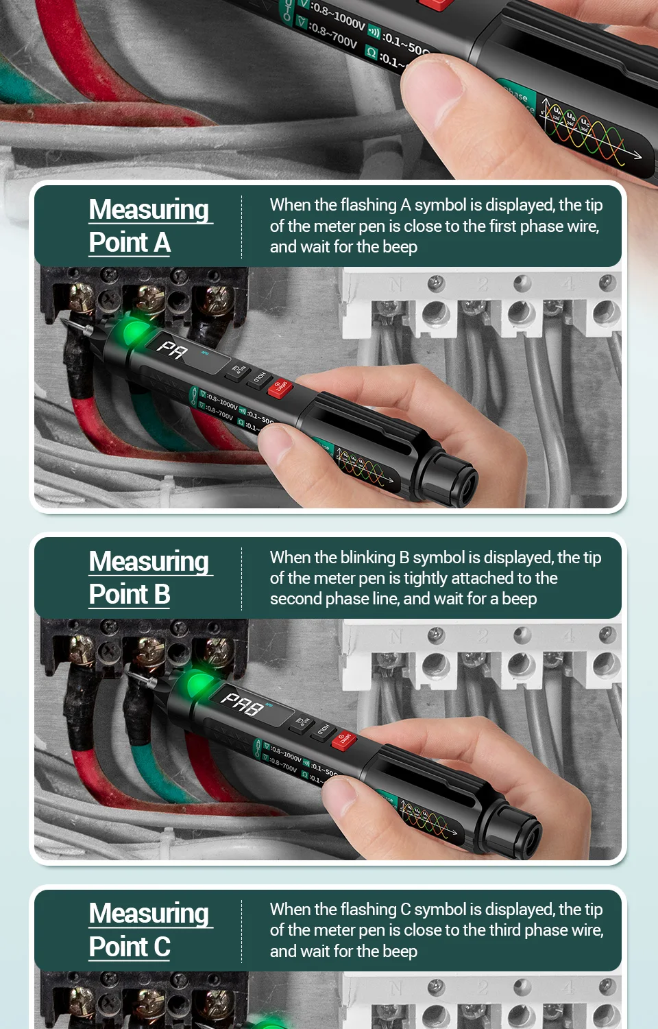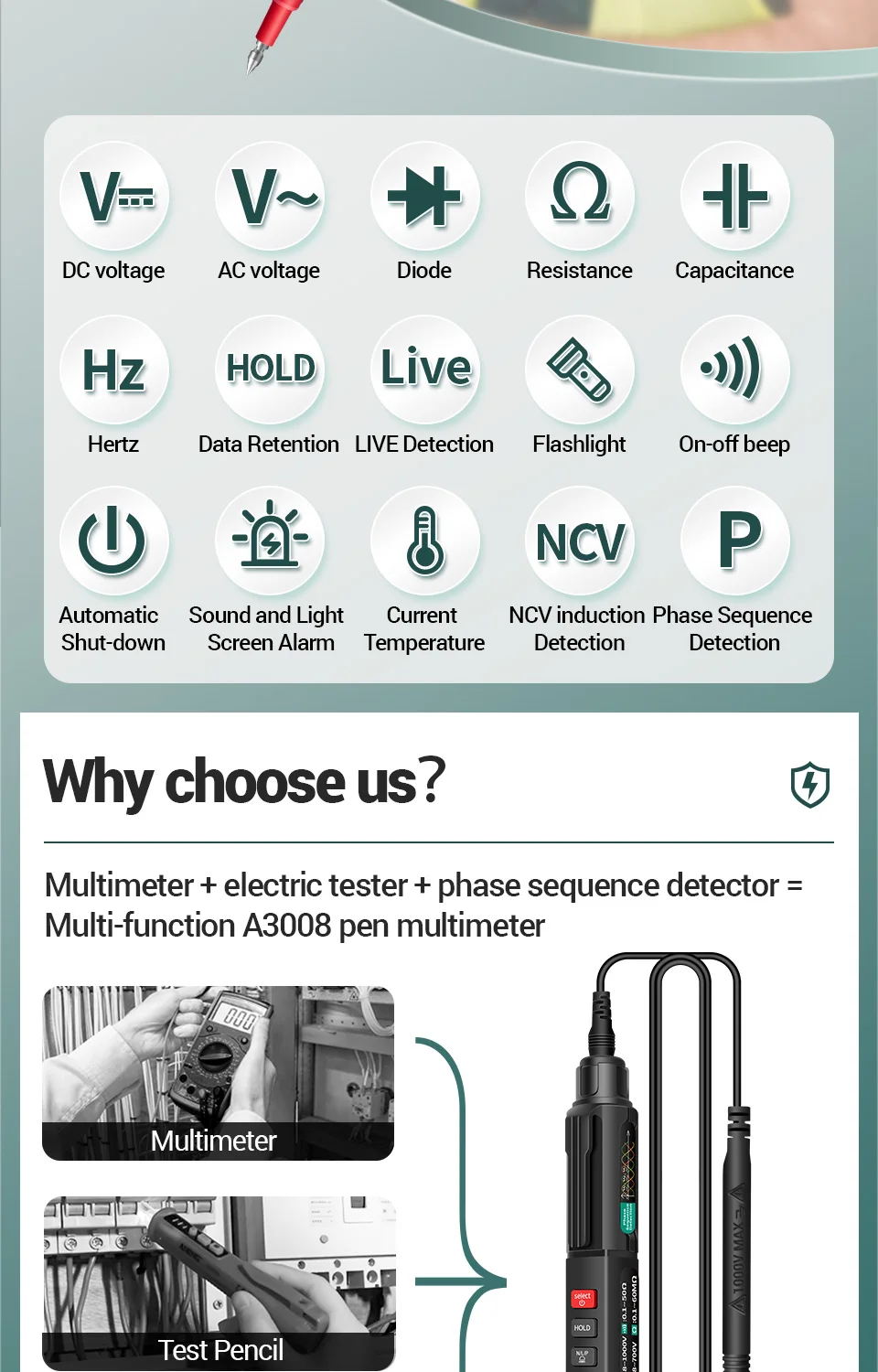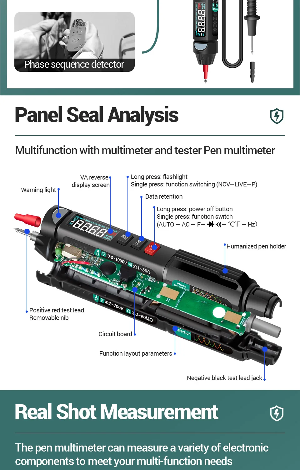 A3007 не включает функцию тестирования фазовой последовательности.Общая особенность:6000 отсчетов цифровой мини умный мультиметрОбнаружение фазовой последовательностиИндукционное Обнаружение ncvСопротивление/ЕмкостьДиод/обнаружение в реальном времени/ГцТемпература токаЭто новый обновленный профессиональный мини-мультиметр, и он может бытьВозможность Тестирования и обслуживания электрического оборудования.Параметр: