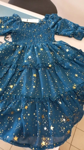 Платье синтетика, смотрится очень нарядно. На девочку 7 лет, размер 8 примерно по колени. Пошив аккуратный, ниток нет.