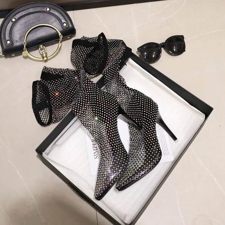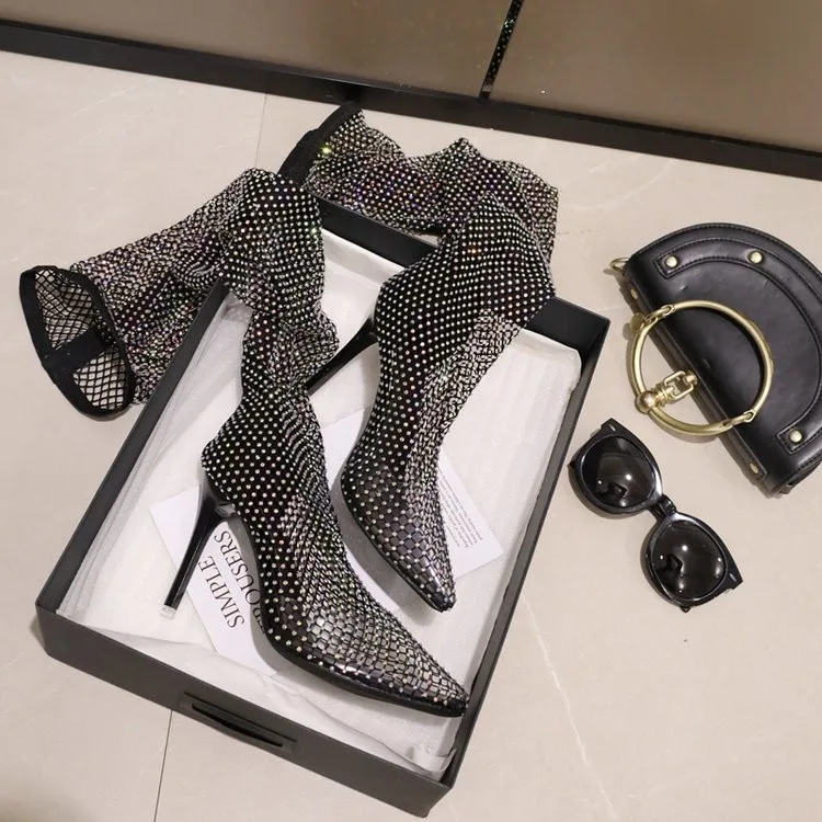 Женские сапоги со стразами, босоножки с острым носком, привлекательные туфли-лодочки на высоком каблуке, сетчатые Сапоги выше колена со стразами