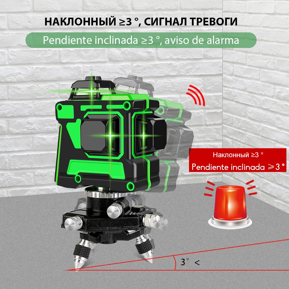 Мощный зеленый лазерный 3D уровень, 12 линий, 360 градусов, горизон...