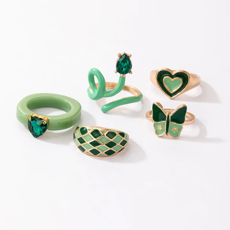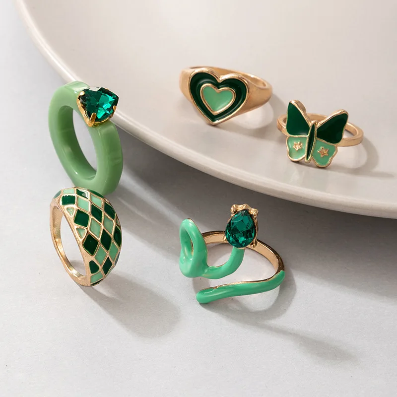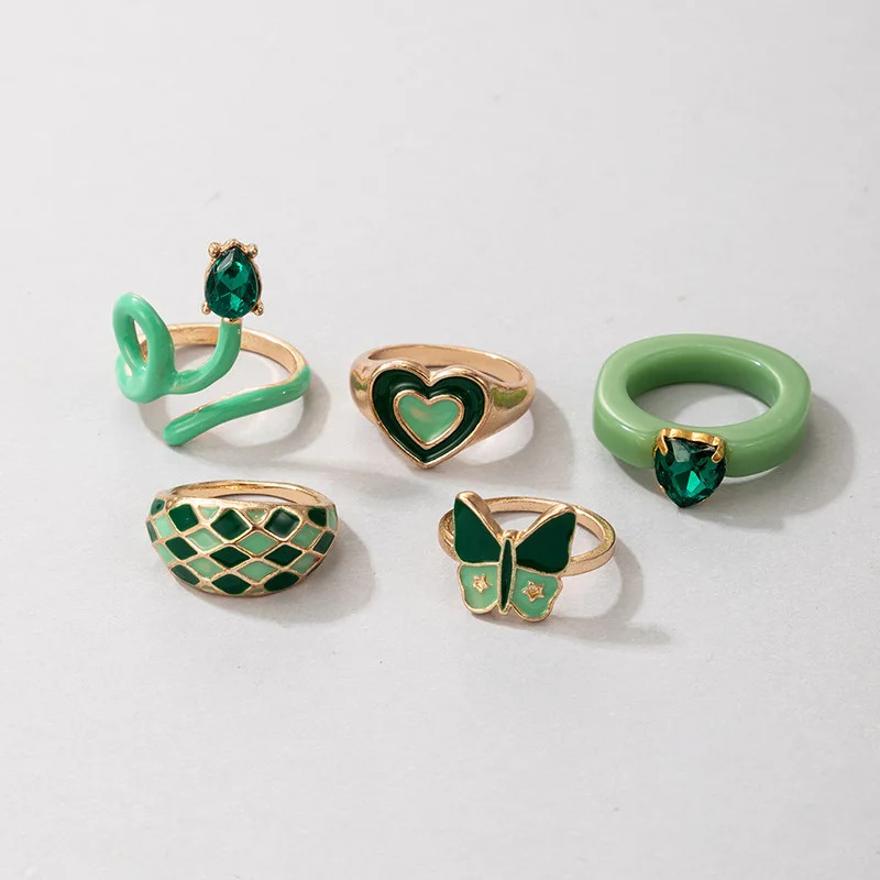 Docona 5 шт.компл. элегантный набор колец с зелеными бабочками и се...