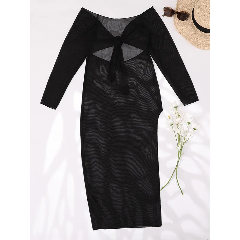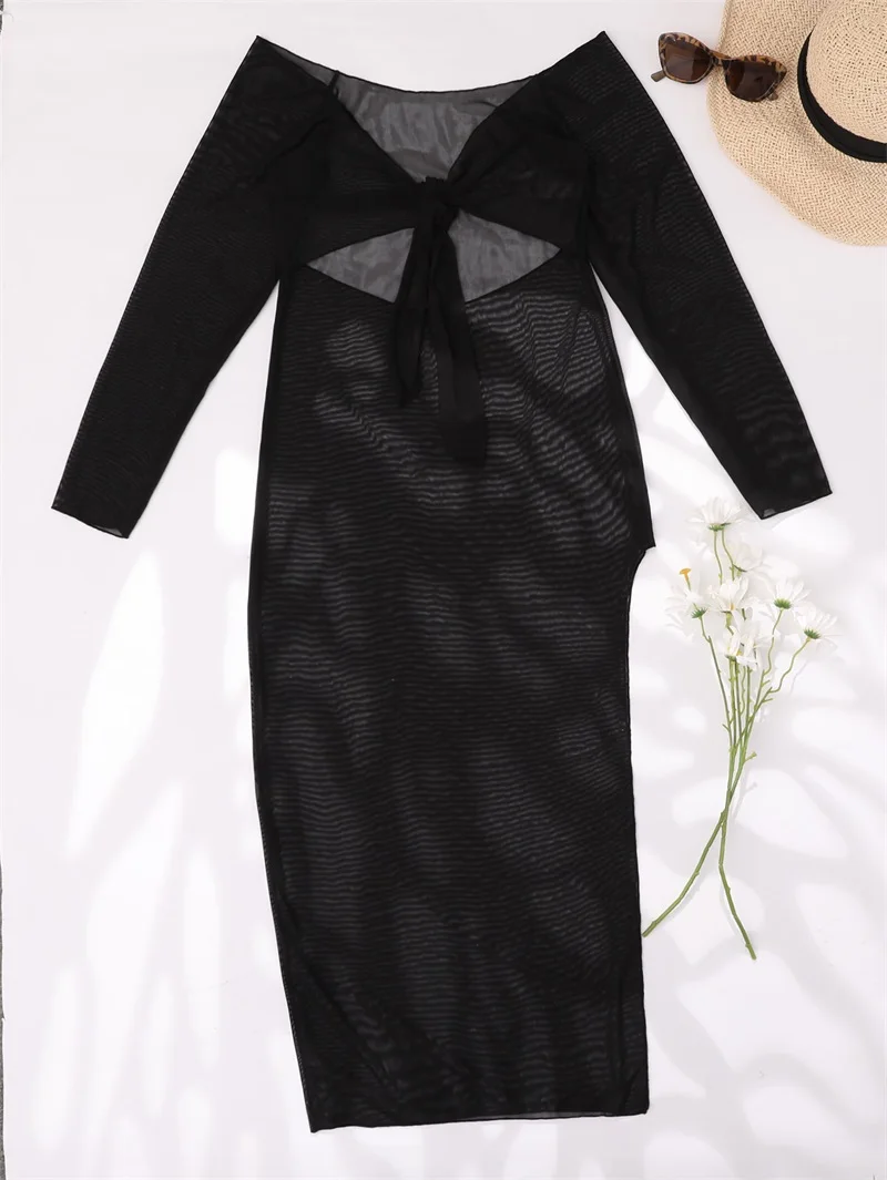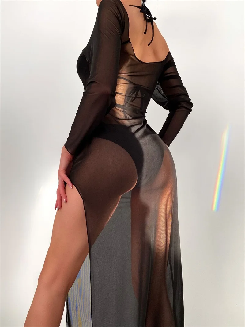 Пикантное прозрачное парео Rinabe, кафтан с высоким разрезом, 2022 халат, женское Бандажное наружное платье, накидки с длинным рукавом, черное платье-саронг