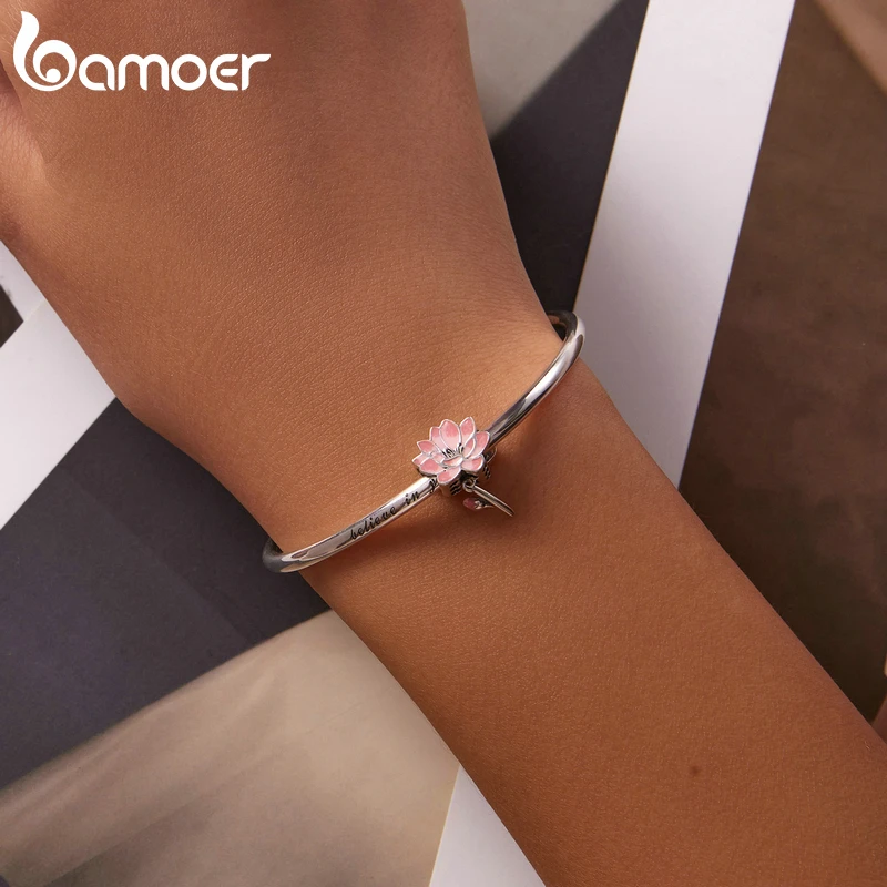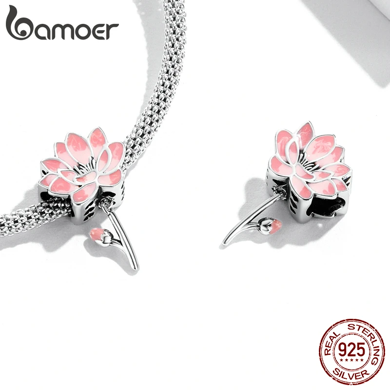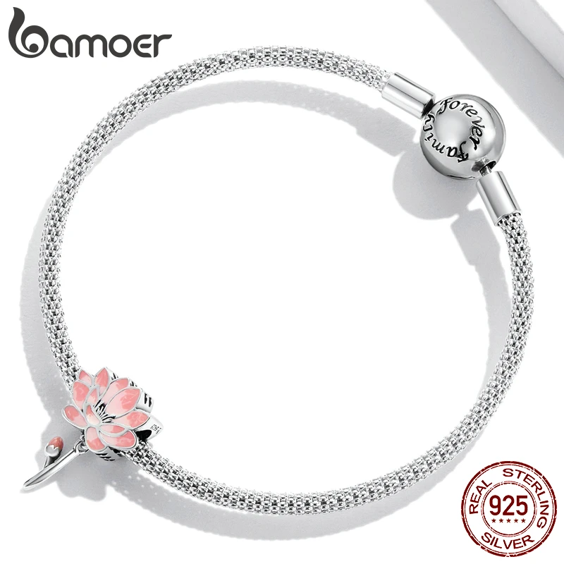 BAMOER, Настоящее серебро 925 пробы, свежий Лотос, очаровательный браслет под змею или браслет, элегантный цветок, бисер, сделай сам, ювелирное изделие, подарок