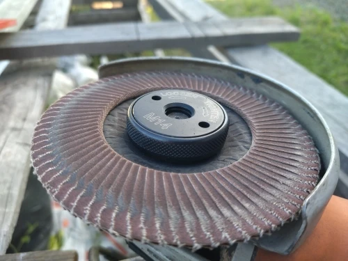 зажимает хорошо, как я понял, прикручивать его можно от руки хоть и есть в нем дырки под ключ, в процессе работы затягивается сам, единственный минус, он сильно громосткий, для шлифовального диска не подходит, ну а если использовать для большой болгарки то минусов тогда не будет