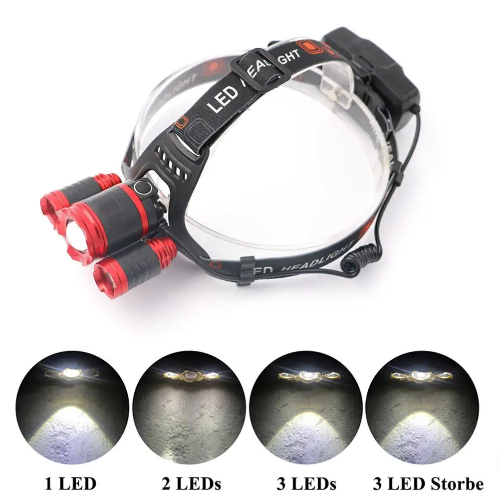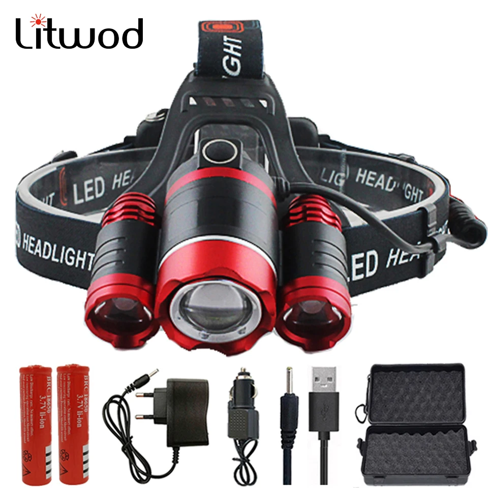 Суперъяркий светодиодный налобный фонарь T6 с фокусировкой, Головной фонарь, лампа с 2 аккумуляторами 18650, зарядное устройство для переменногоавтомобиляUSB