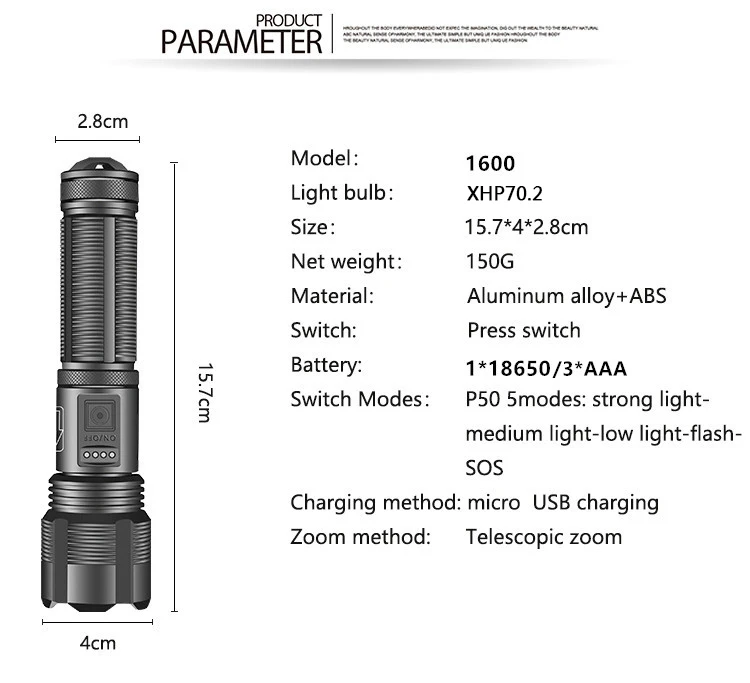 Фонарик XHP50XHP70 с USB-зарядкой, Водонепроницаемый Многофункциона...