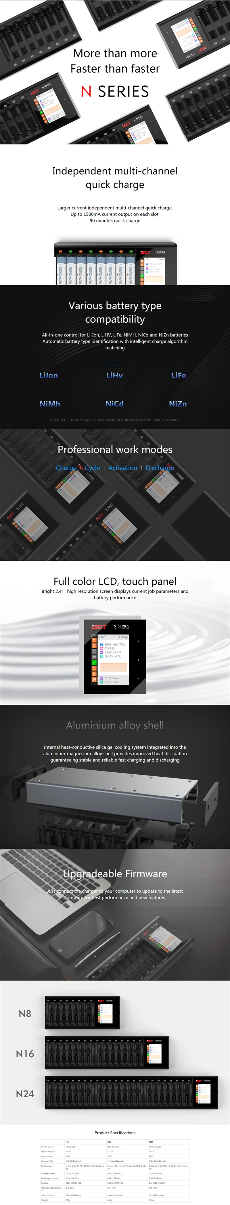 1. Большая независимая Многоканальная быстрая зарядка, до 1500ма выходной ток на каждом слоте, быстрая зарядка 90 минут.