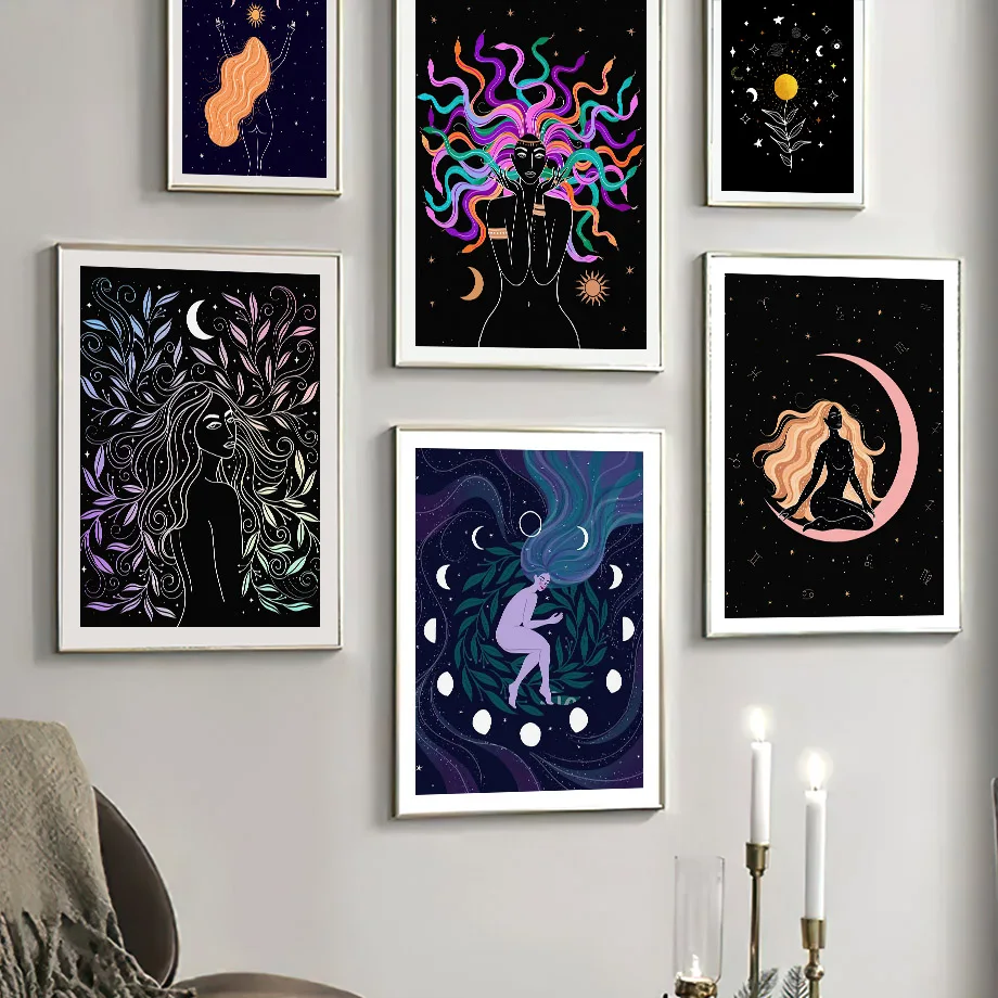 Абстрактная ведьма, волосы, солнце, луна, космос, цитаты, настенное искусство, холст, живопись, скандинавские постеры и принты, настенные картины для декора гостиной