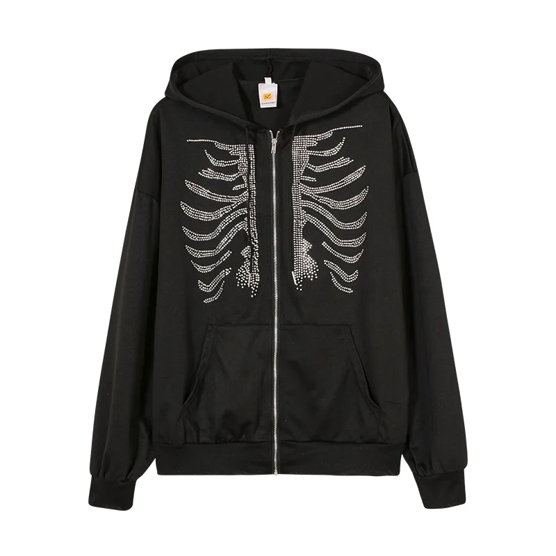 Y2K Стразы худи Скелет женские готические черные на молнии оверсайз...