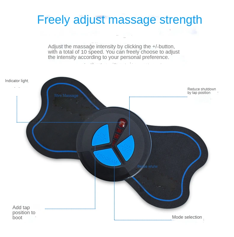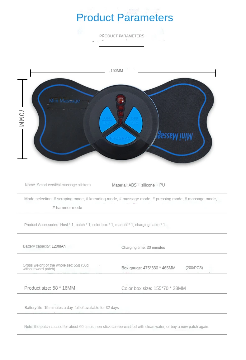 Небольшой размер, легкий, легко носить с собой и хранить.10 режимов регулировки, для удовлетворения различных потребностей.Массажная часть: Шея/спина/талия/бедра/ноги и другие частиТехника массажа: шиацу, разминание, постукивание, массажСпецификация:Режим использования: A ~ F (6 режимов)Частота: 1 ~ 100 ГцВремя работы: 12 минутВыходной ток: до 9,8 мАМассажный контакт: 2Инструкции:1. Закрутите хост с помощью гелевой накладки.2. Откройте прозрачную пленку на гелевой пластылке.3. Прикрепите инструмент к области, где вам нужно массировать.4. Нажмите кнопку «ON/», чтобы включить ее, светильник всегда включен, нажмите кнопку «on/» снова, чтобы начать, светильник мигает.5. Нажмите кнопку программы, чтобы выбрать нужный режим.6. Отрегулируйте интенсивность массажа, которая вам подходит. Продолжайте нажимать «ON/», чтобы увеличить интенсивность и «OFF/DEL», чтобы уменьшить интенсивность.