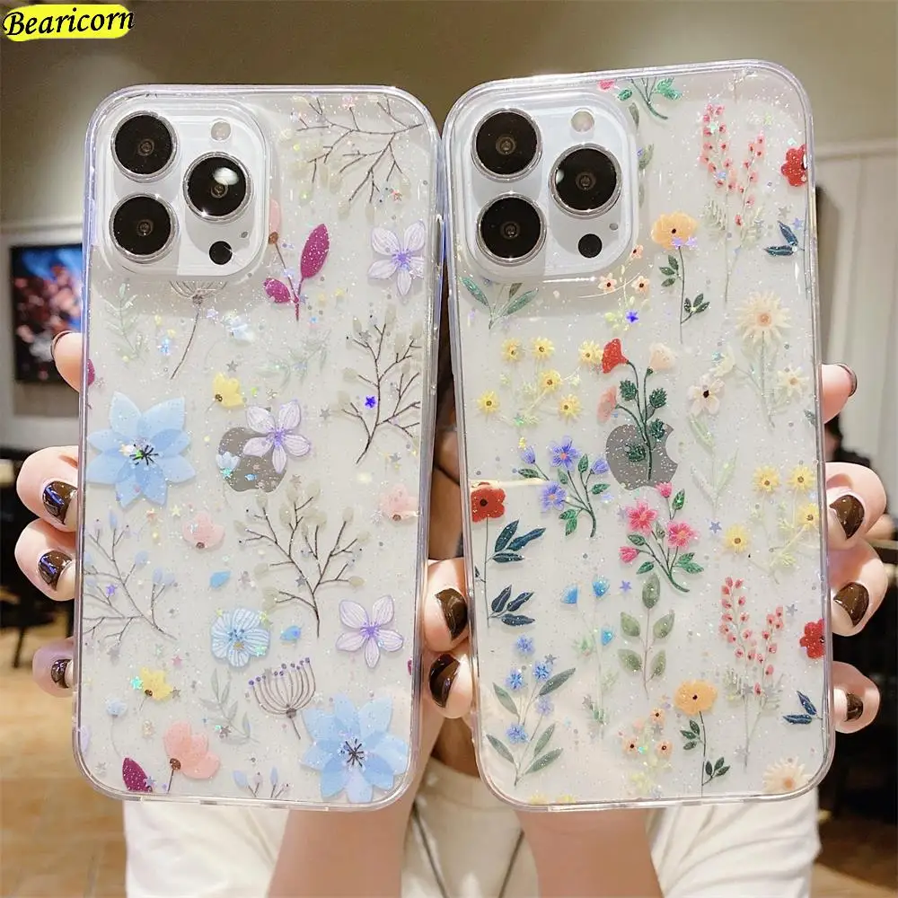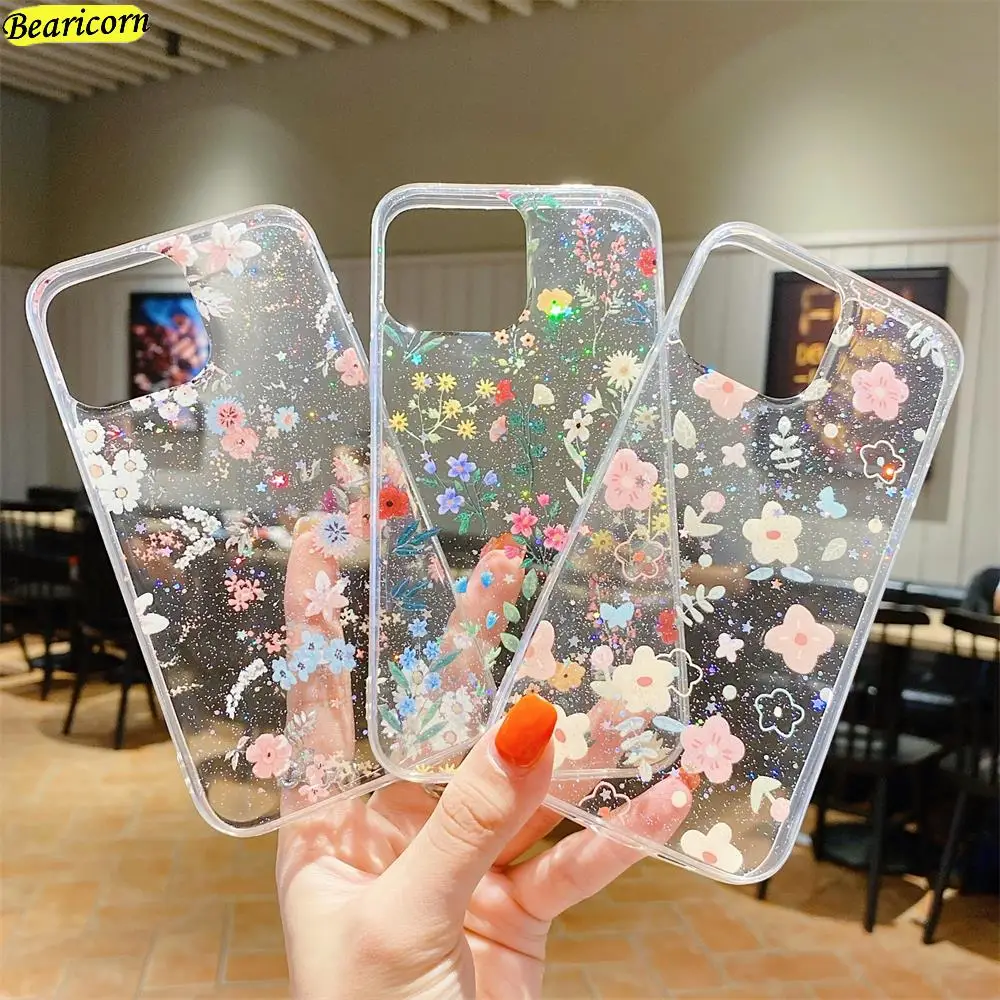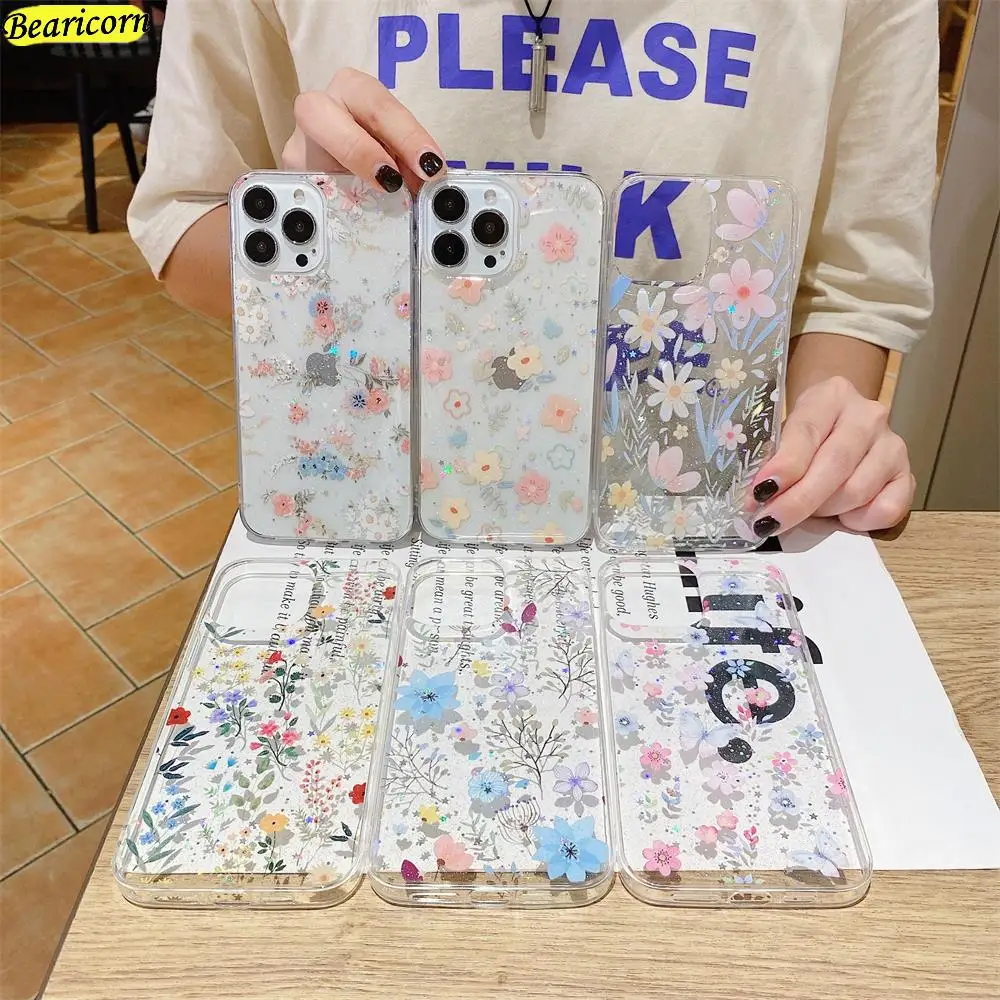 Модный прозрачный чехол для телефона с цветами для iPhone 13, 12, 11 Pro Max, X, Xs, XR, 7, 8 Plus, SE 2020, роскошный мягкий Блестящий цветочный чехол