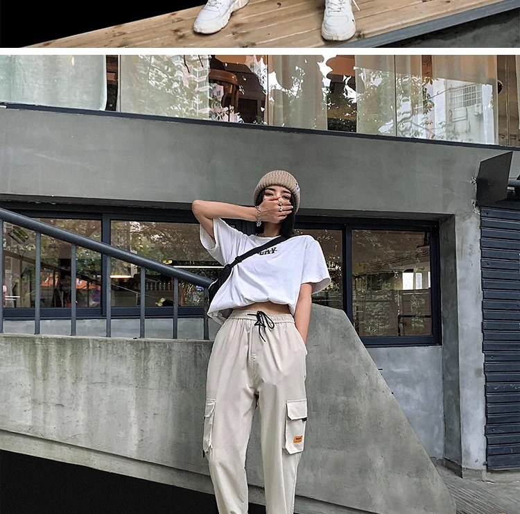 Брюки женские с эластичным поясом, уличная одежда, черные спортивные мешковатые штаны в Корейском стиле, брюки в стиле хип-хоп, Харадзюку, лето-осень
