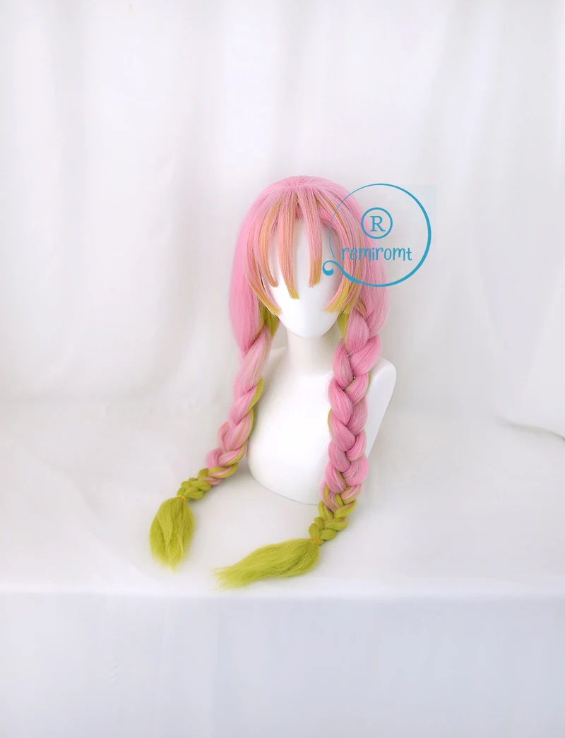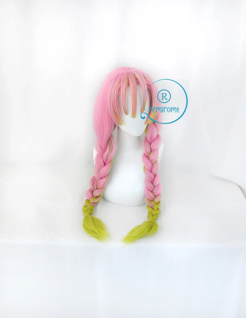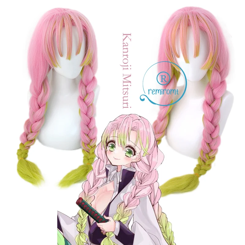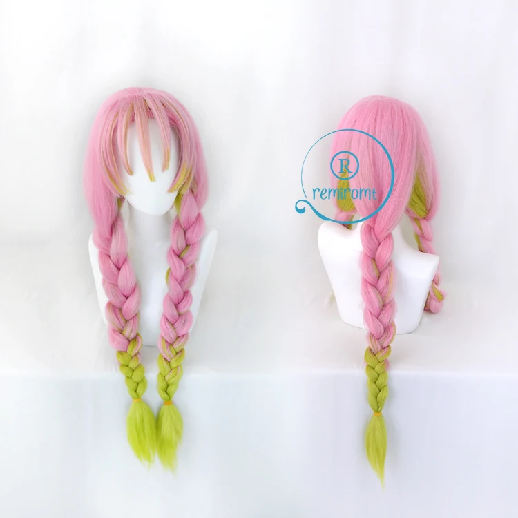 Длинный парик для косплея Kanroji Mitsuri из аниме рассекающий демонов, с розовыми и зелеными волосами с градиентом, из волокна, для Хэллоуина
