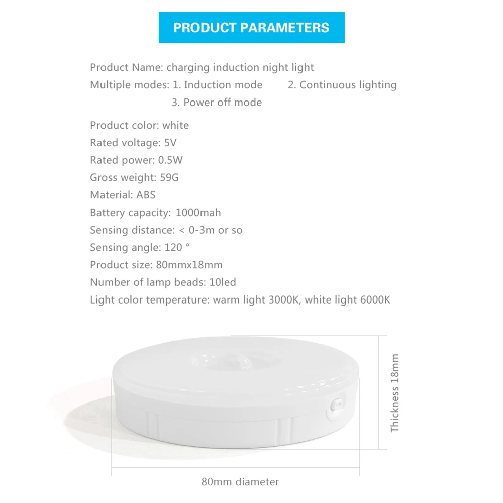 * 2. Светильник с датчиком движения поддерживает зарядку через USB благодаря встроенному аккумулятору большой емкости 1000 мАч, полная зарядка может использоваться в течение 30-50 дней.