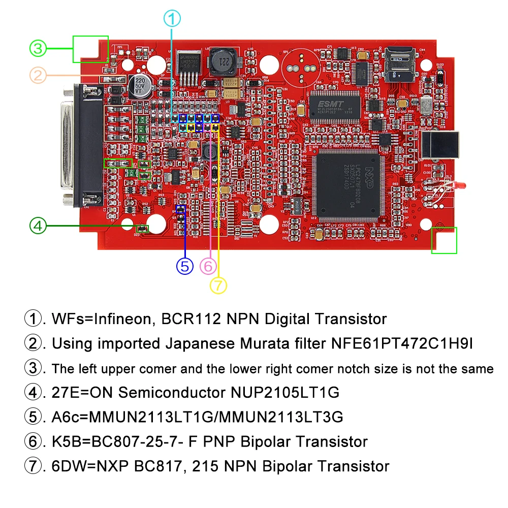 1. Левый верхний угол и нижний правый угол размера не совпадают2. WFs = Infineon, BCR112 NPN Цифровой транзистор3. 27E = на полупроводнике NUP2105LT1G4. 6DW = NXP BC817,215 NPN биполярный транзистор5. A6c = MMUN2113LT1G / MMUN2113LT3G6. K5B = BC807-25-7-F PNP биполярный транзистор7. Использование импортированного японского Мурата фильтра NFE61PT472C1H9L