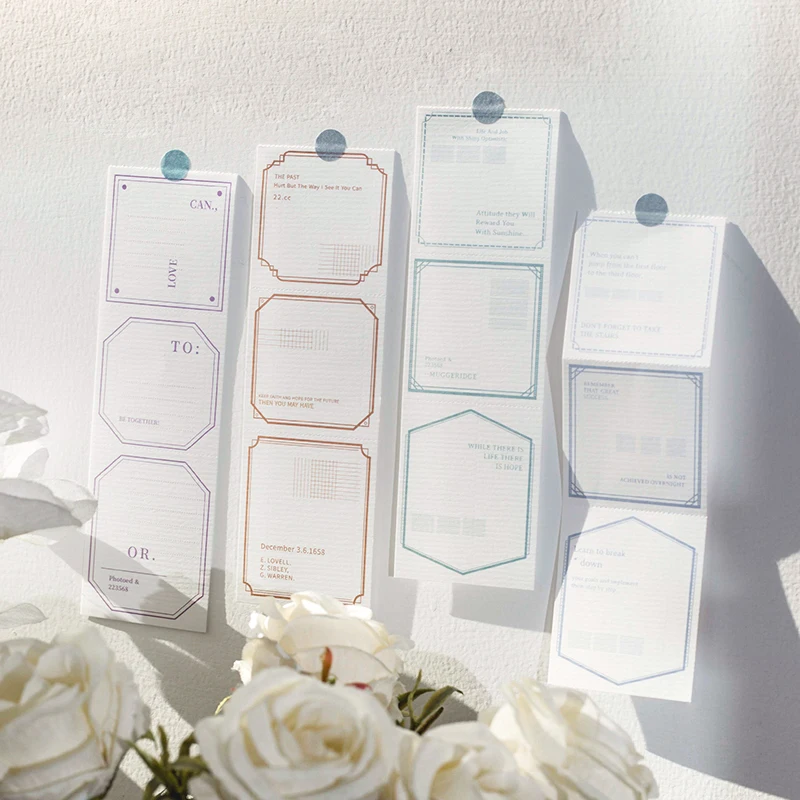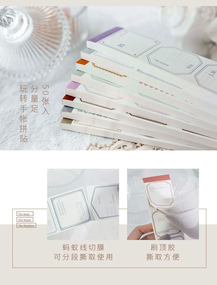 Товар: блокнотМатериал: линейная бумагаСпецификация: 5 узоров x 10 листов = 50 листовРазмер: 15,5х4, 5 смВес: 38 гАртикул: 8 стилей