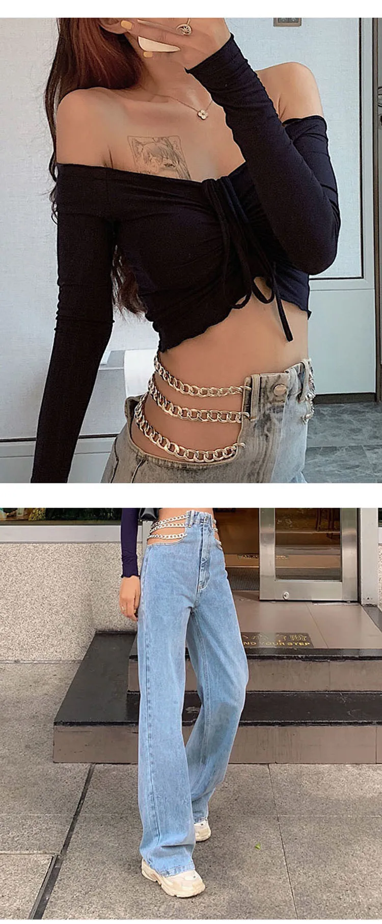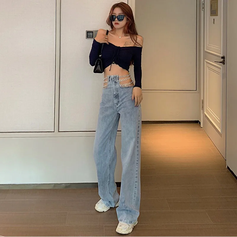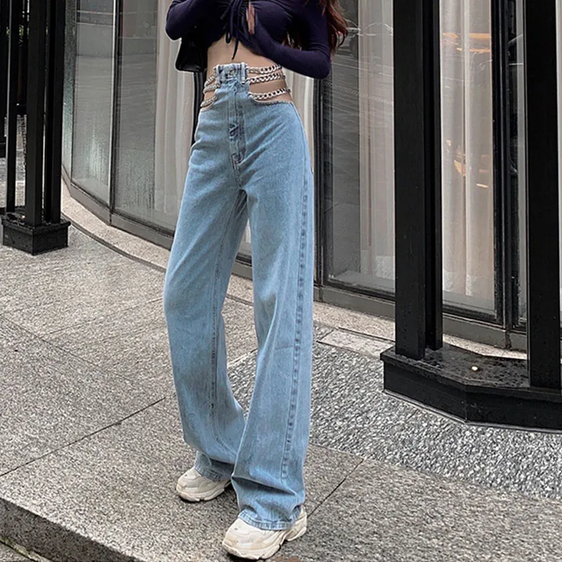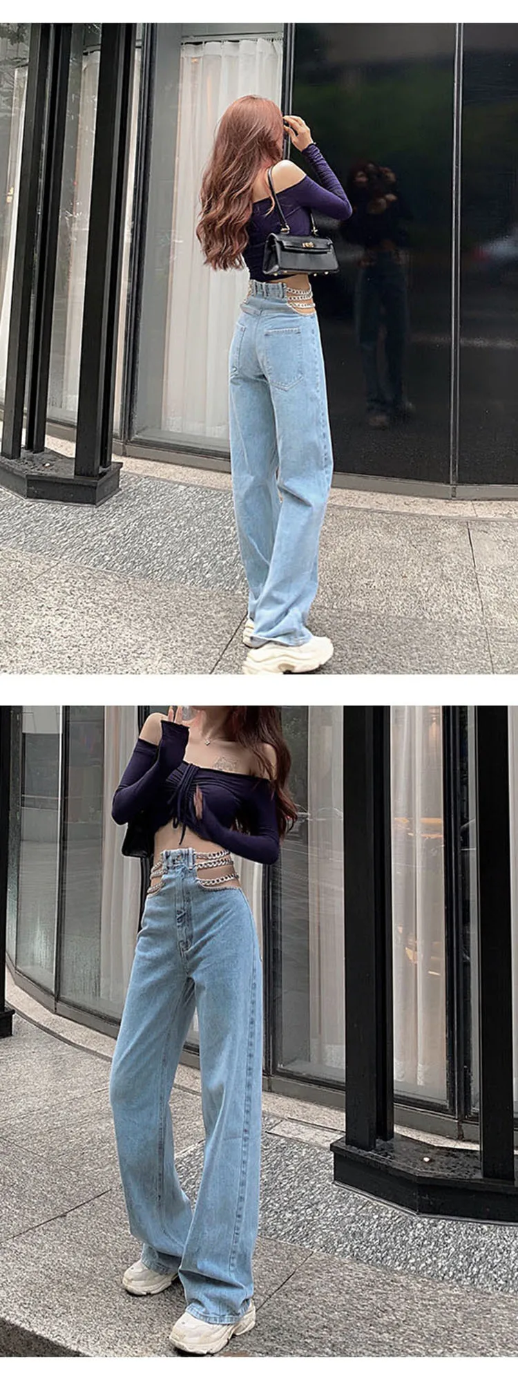 Уличная одежда с перекрестными лямками, модные пикантные с широкими штанинами, с вырезами по бокам, элегантные европейские брюки, джинсы KZ355, женские джинсы с цепочкой на талии