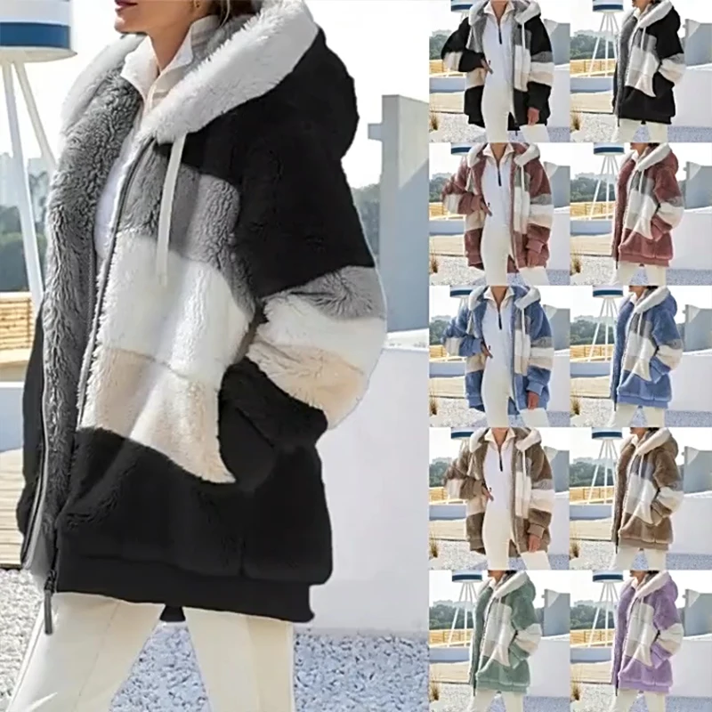 Куртка женская плюшевая с капюшоном, теплая уличная одежда на молни...