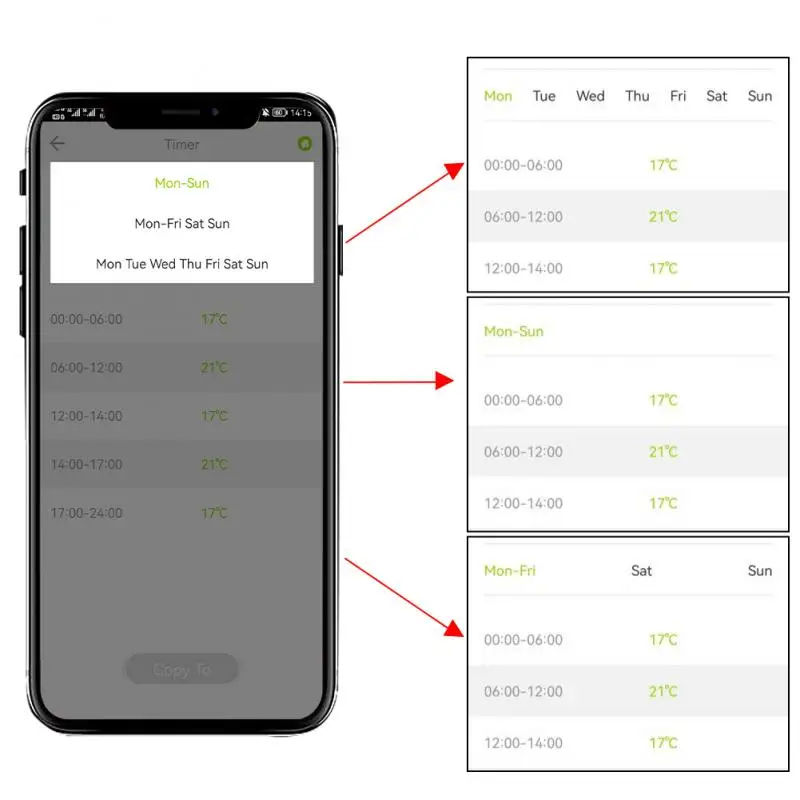 4. Программируемый график с еженедельным выбором программ: поддерживает ручную настройку 5 + 2, 7 дней еженедельного расписания с 5 сроками для опции, предоставляя вам максимальное удобство для различных ситуаций и устанавливая Индивидуальный график для температуры вашего дома. Праздничный режим, автоматический режим, И ручной режим, доступный для дополнительного удобства; Открывание окна и офсетная температура для этого TRV контроллера для дополнительного удобства.
