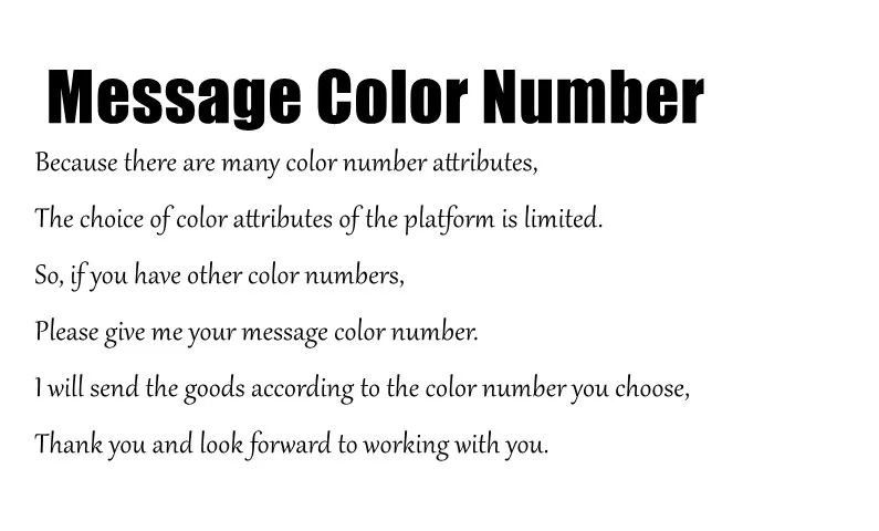 1. Поскольку существует множество атрибутов цветовых номеров,2. Выбор цветовых характеристик платформы ограничен.3. Так, если у вас есть другие номера цветов,4. Пожалуйста, сообщите мне свой номер цвета.5. Я отправлю товар в соответствии с номером цвета, который вы выбираете,6. Спасибо и надеемся на сотрудничество.