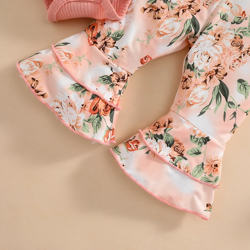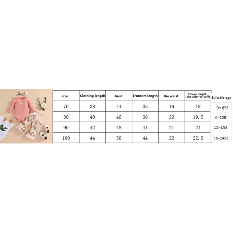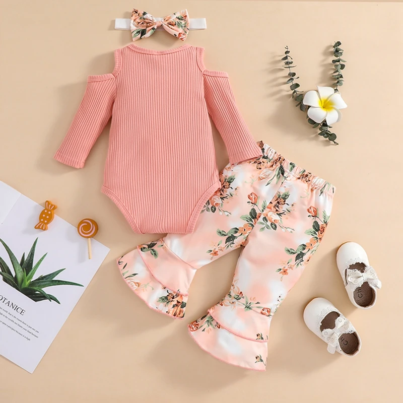 Детский костюм из 3 предметов, комбинезон с круглым вырезом, длинным рукавом и открытыми плечами, брюки с цветочным принтом и повязка на голову для детей 0-24 месяцев