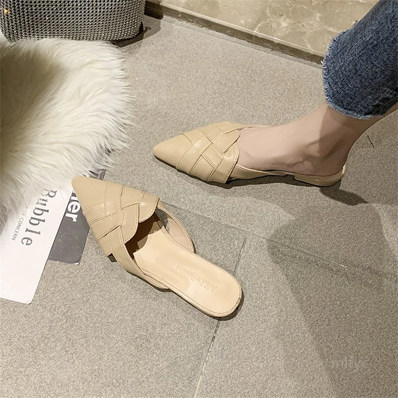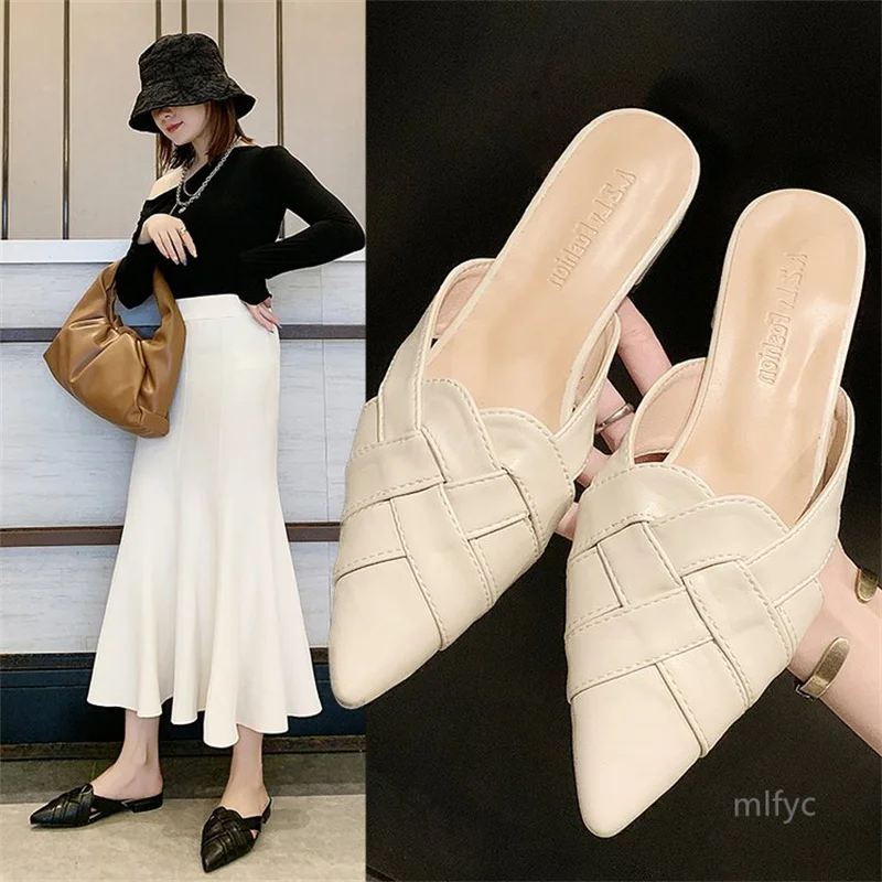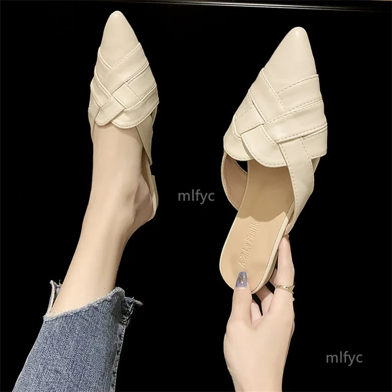 Женские остроносые полутапочки в Корейском стиле, новинка весны 2021, мягкие кожаные сандалии, женская верхняя одежда, мюли на среднем каблуке, женская обувь