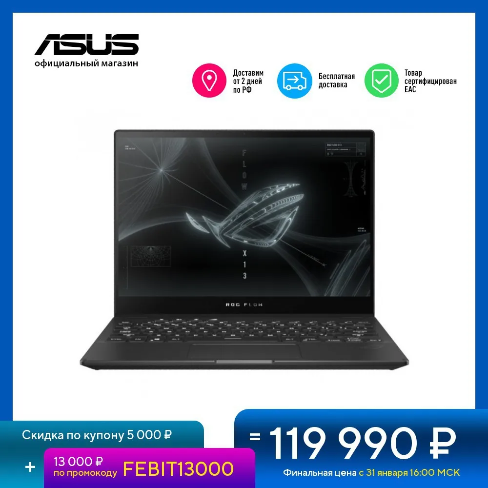 НОУТБУК ASUS ROG Flow X13 GV301QC-K6010 13.4' WUXGARyzen 7 5800HS16 Gb1 Tb SSDGeForce RTX 3050No OSBlack
