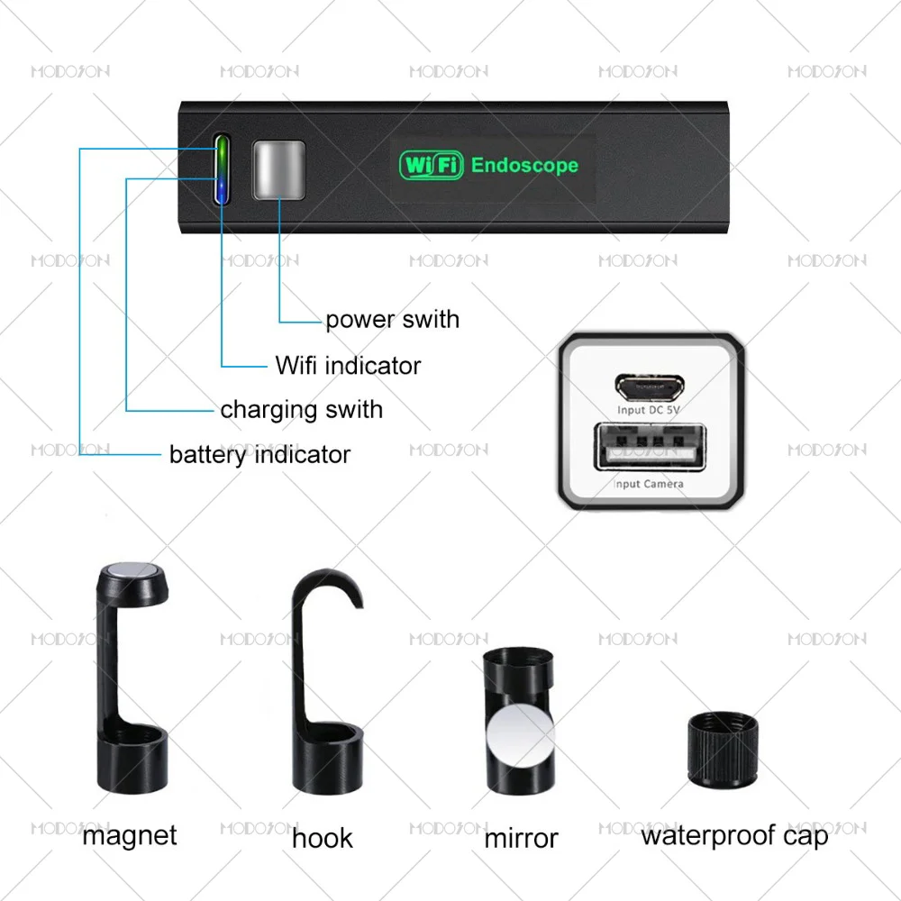 1 * WIFI эндоскоп1 * зарядный кабель1 * Руководство пользователя1 * боковое зеркало1 * магнит1 * крючок