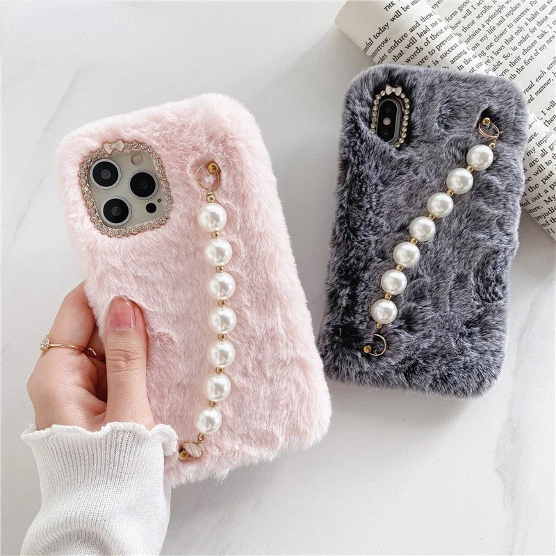 FeaturesLuxury Warm Fur Plush Diamond Wrist strap Phone Case iphone 12 pro max