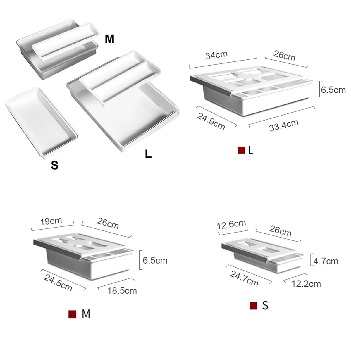 Посылка включает в себя: 1 ящик для хранения Цвет: белый Количество: 1 шт. Размер: S / M / L Материал: пластик Как использовать: 1. Убедитесь, что место должно быть установлено чистым и гладким. 2. Оторвите ленту с задней стороны и нажмите поднос на стороне под столом. 3. Удерживайте нажатие на все области ящика более 30 секунд, чтобы сделать его сильнее. 4. Используйте после 24 часов бездействия.