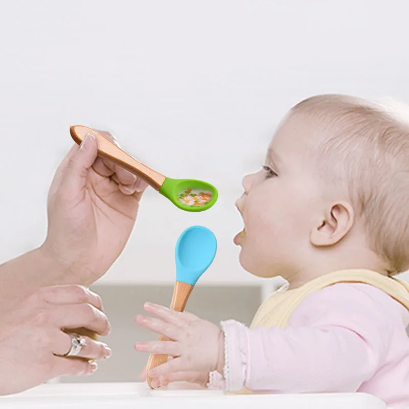 Силиконовая детская ложка, деревянная Нескользящая ложка карамельно...