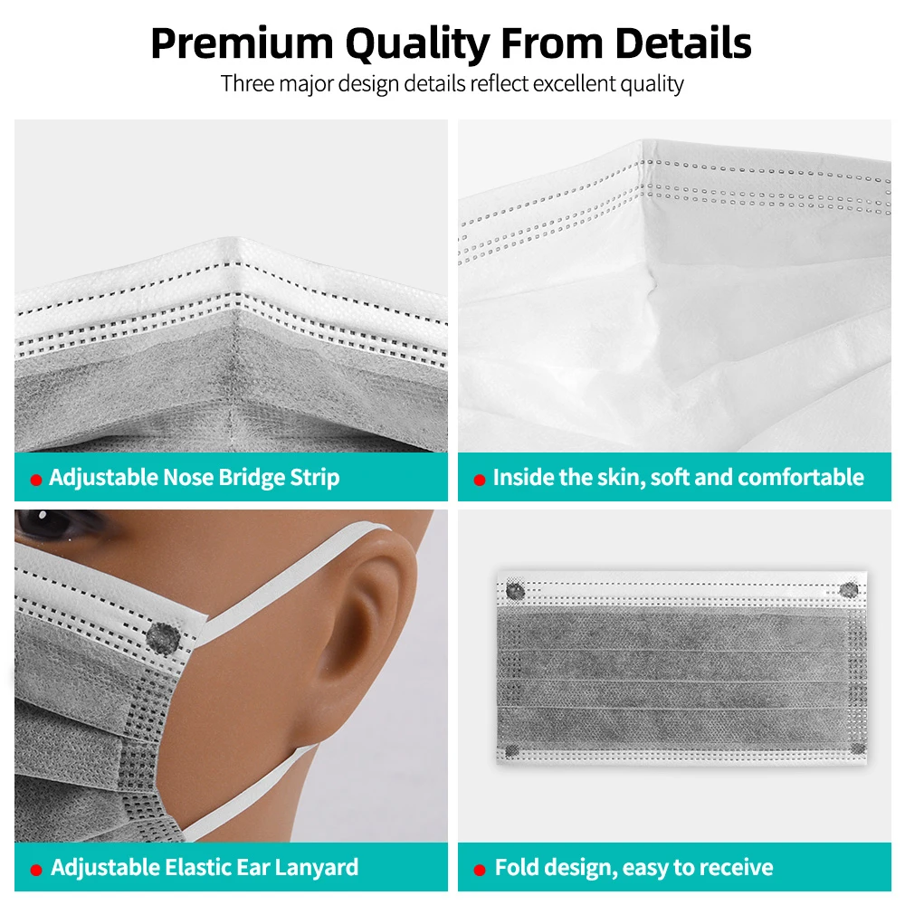 Маска одноразовая с активированным углем для взрослых, 4 слоя, 102050100200 шт.