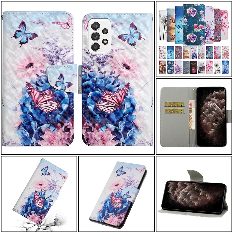 Кожаные чехлы-книжки с рисунком для телефона Galaxy A03S A22 A72 A5...