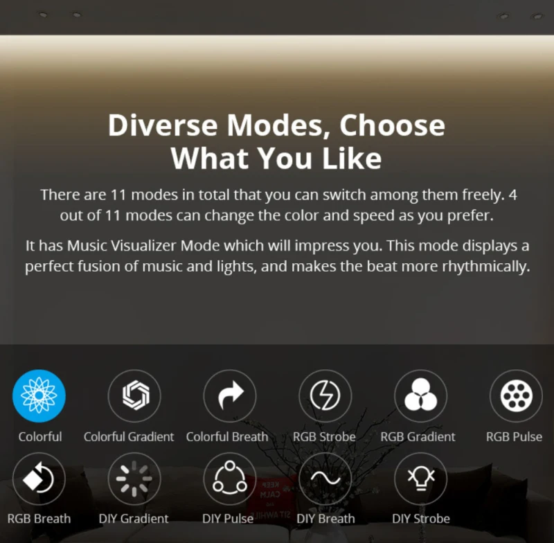 Со встроенным высокочувствительным микрофоном, SONOFF L2 lite light strip может танцовать с любым типом музыки в режиме музыкального визуализатора. И вы можете использовать режимы сцены, чтобы создать более романтическую атмосферу для вашей даты, или определить свою собственную сцену, чтобы лучше адаптировать ваше окружающее.
