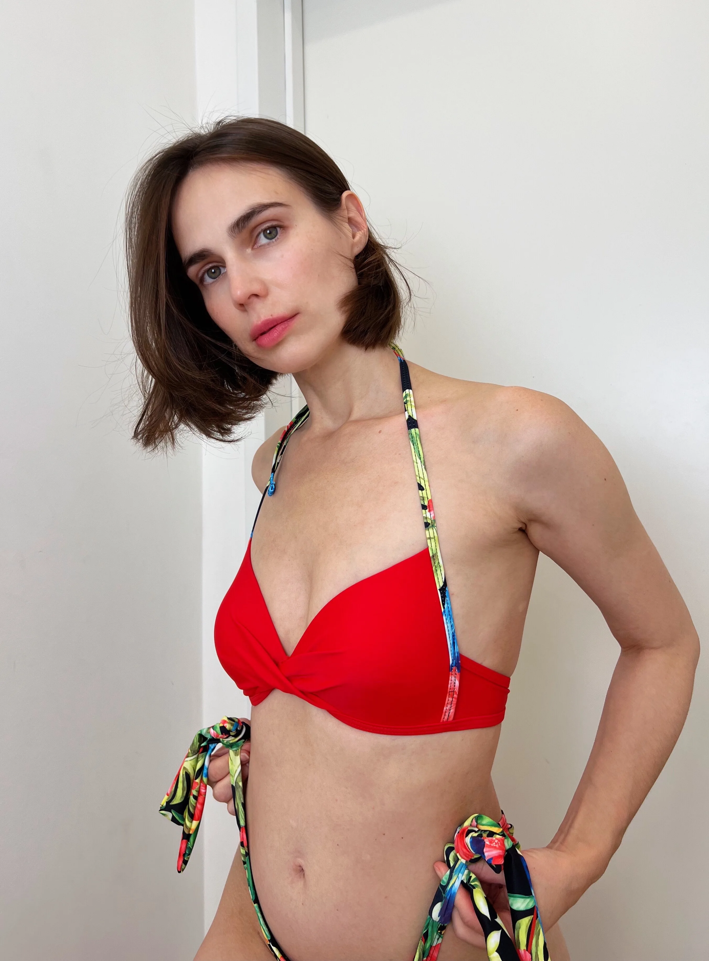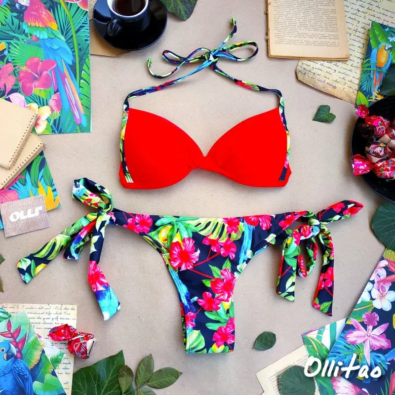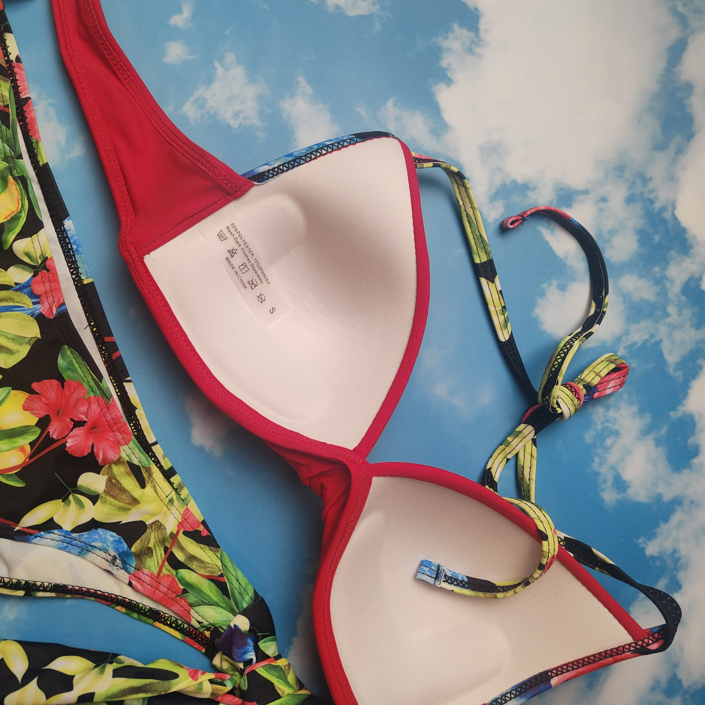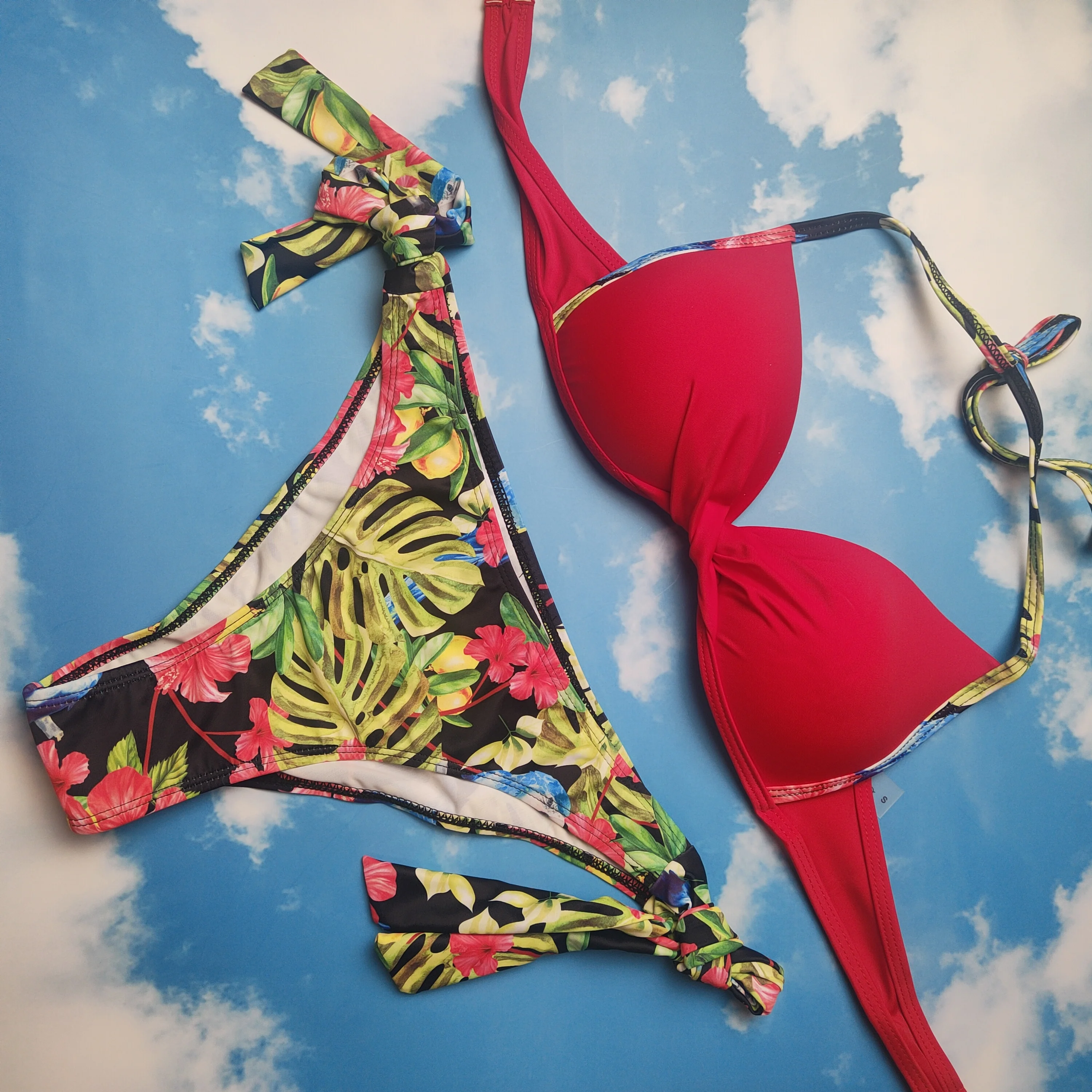 Купальник оказался такой яркийм красный и яркий принт с листьями, цветами и птицами Ткань: 85% полиэстер и 15% спандекс. Лиф в принципе без новоротов в крое. Обычный, традиционный лиф от купальника с завязками на шее Сам лиф красный. Лямки и кант из ткани с тропическим принтом. Такая ткань у нас на трусиках. Спереди на лице ткань как бы на запАх, образуются складки Внутри лифа имеется подклад. Чашки сформированы, имеют форму Сзади застежка в виде металлического крючка. Лямки не съёмные, они просто завязываются на шее Вот трусики классные с возможностью регулировать объем. Конечно, все в пределах разумного. По бокам имеются завязки в тон лифу. Внутри есть подклад, он только спереди трусиков Я взяла в размере S. Сел комплект отлично. Лиф сидит плотно. А вот такие трусики можно регулировать объем за счёт завязок