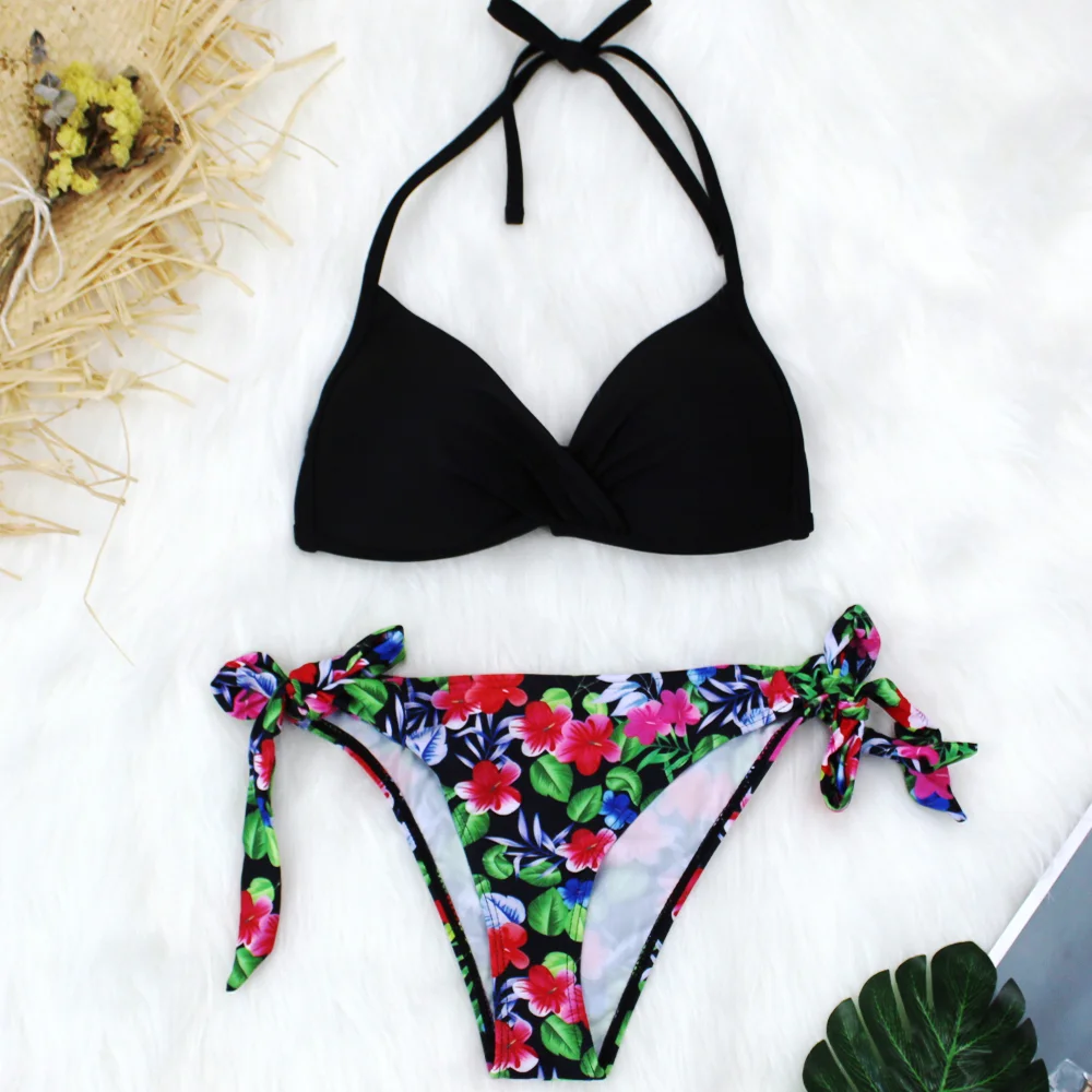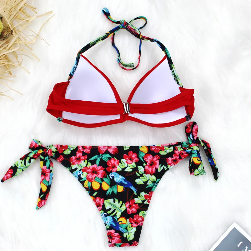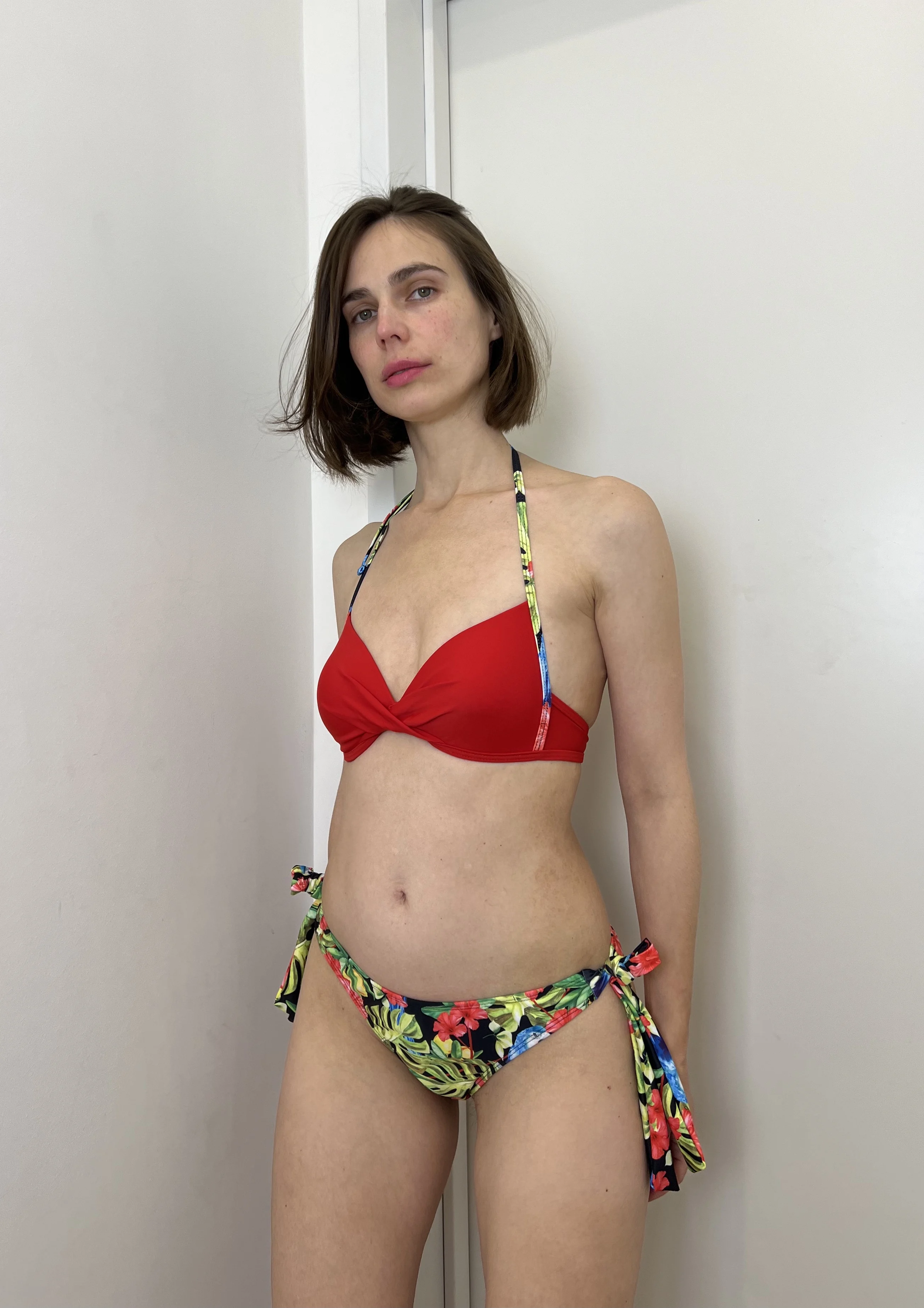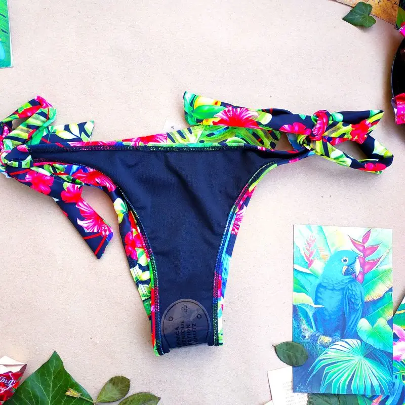 Купальник оказался такой яркийм красный и яркий принт с листьями, цветами и птицами Ткань: 85% полиэстер и 15% спандекс. Лиф в принципе без новоротов в крое. Обычный, традиционный лиф от купальника с завязками на шее Сам лиф красный. Лямки и кант из ткани с тропическим принтом. Такая ткань у нас на трусиках. Спереди на лице ткань как бы на запАх, образуются складки Внутри лифа имеется подклад. Чашки сформированы, имеют форму Сзади застежка в виде металлического крючка. Лямки не съёмные, они просто завязываются на шее Вот трусики классные с возможностью регулировать объем. Конечно, все в пределах разумного. По бокам имеются завязки в тон лифу. Внутри есть подклад, он только спереди трусиков Я взяла в размере S. Сел комплект отлично. Лиф сидит плотно. А вот такие трусики можно регулировать объем за счёт завязок