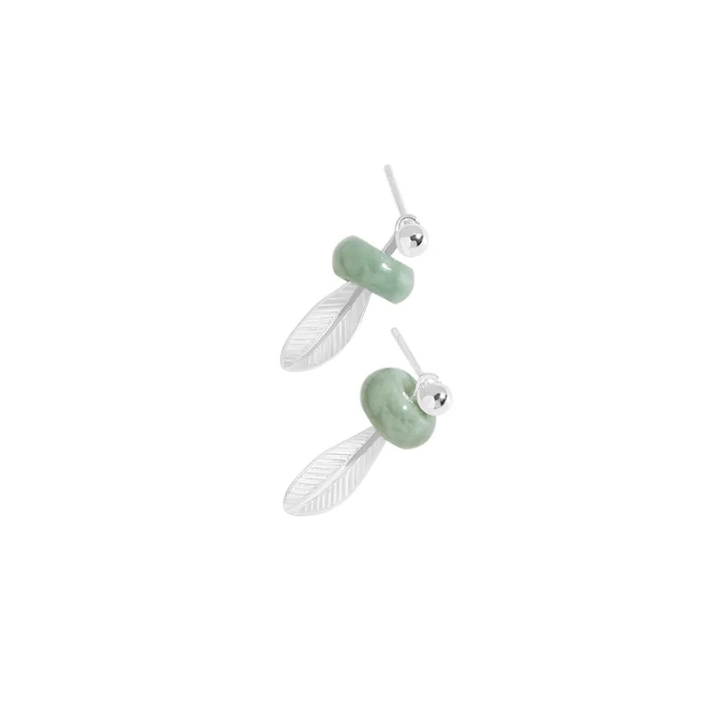 Оригинальные серьги-кольца с зеленым нефритом И птичьими перьями