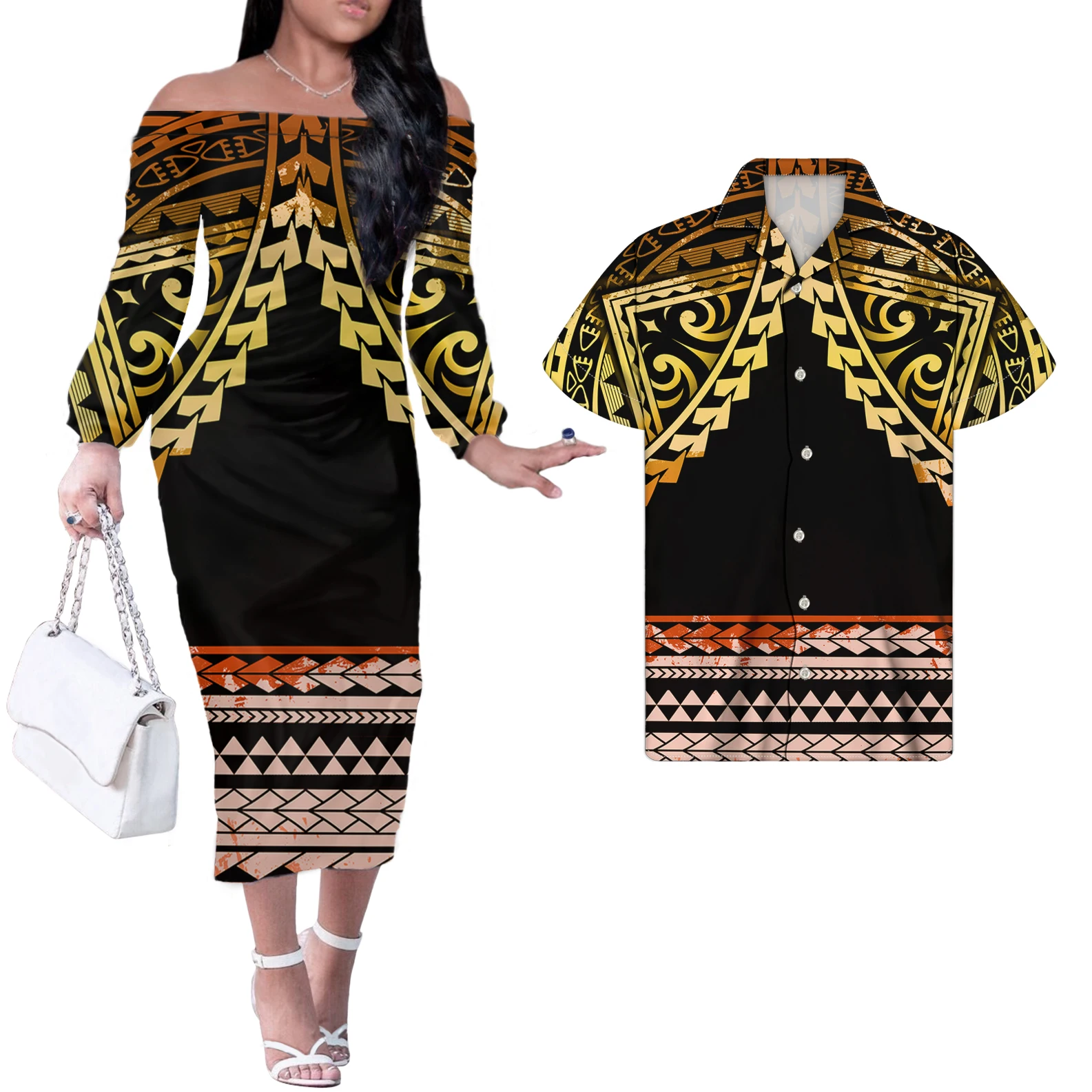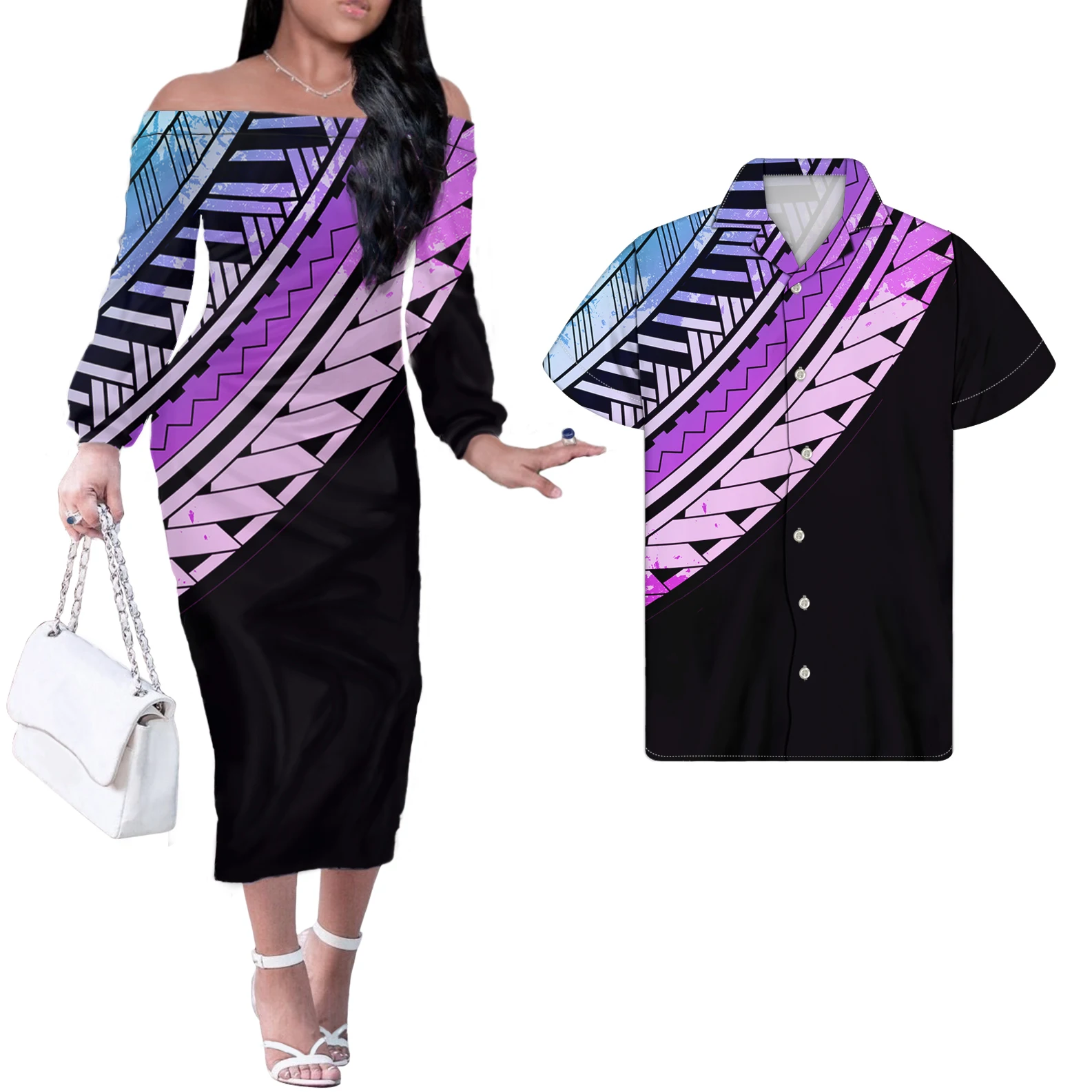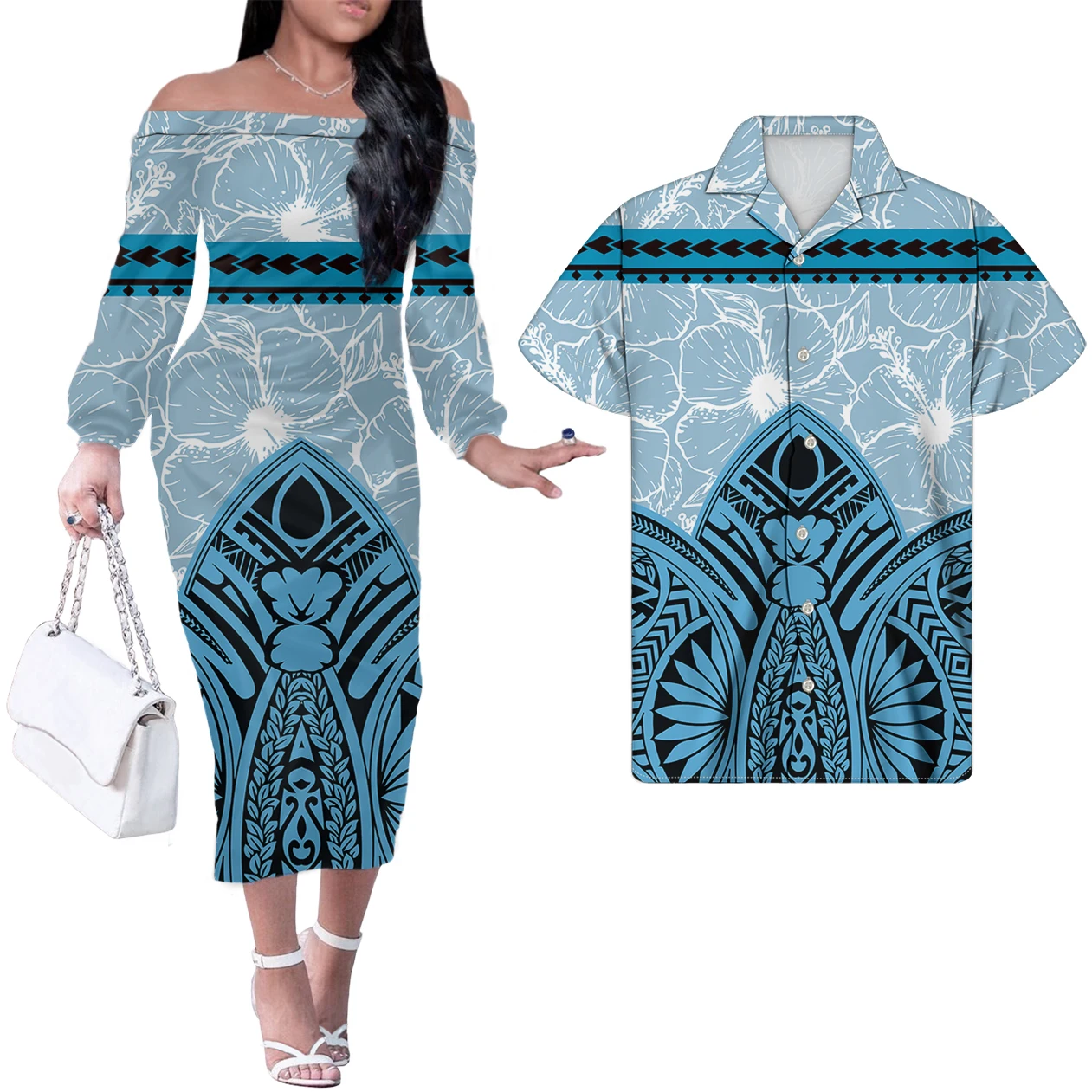 Комплект из 2 предметов для женщин, полинезийская Гавайская французская одежда с принтом, пикантное платье с открытыми плечами, мужская рубашка и топ