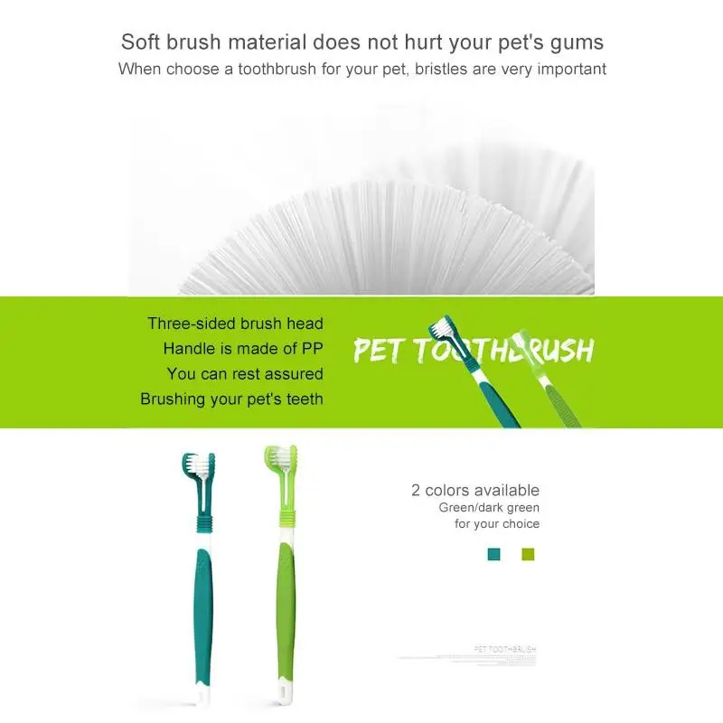 Трехсторонняя конструкция зубной щетки может очищать зубы домашних животных во всех направлениях, предотвращать зубной камень и эффективно защищать зубы домашних животных и поддерживать чистоту рта.